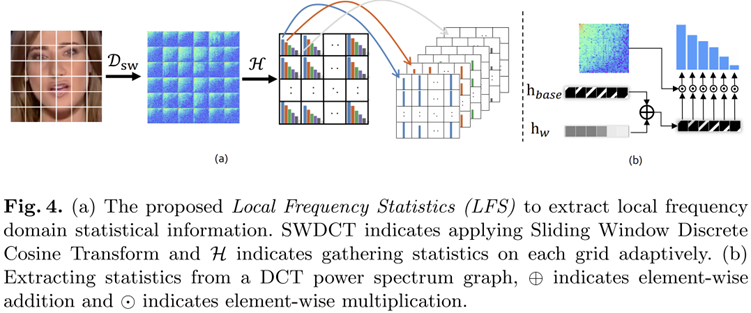 방식은 매우 간단합니다. 먼저 지역적인 주파수 경향성을 파악하기 위해 Sliding Window 방식으로 DCT를 수행하여 각 패치 간 주파수를 추출합니다. 이를 $\mathcal{D}_{\text{sw}} \{ \cdot \}$이라고 부르죠. 다음으로는 각 패치별 주파수의 통계량을 추출합니다. 이를 위해 FAD와 유사하게 주파수를 다시 등간격으로 쪼개고 각 주파수별 전체 에너지량을 히스토그램화 하여 정리하게 됩니다. 이를 $\mathcal{H} (\cdot)$로 표현됩니다. 각 패치 별로 쪼개진 주파수의 개수가 $M$개라고 할 때 총 $M$개의 주파수 통계량을 각각 하나의 채널에 묶어 표현하여 multi-channel feature map으로 구성해줍니다. 이 과정이 LFS이죠. 이때. 그림 4의 (b)는 다음과 같이 수식으로 표현됩니다.