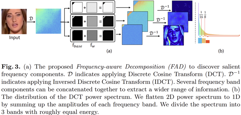 2) 이제 실제 영상과 위조 영상을 주파수 도메인으로 변환해서 분석해보도록 하죠. 여기서는 기본적으로 모두 이산 코사인 변환 (Discrete Cosine Transform; DCT)를 사용하여 본 논문에서 제안된 두 가지 모듈인 FAD와 LFS를 기반으로 설명합니다. 비록 영상 도메인에서는 LQ 영상일 수록 위조 흔적을 찾기 어려웠지만 주파수 도메인에서는 그 경향이 뚜렷하게 나타나는 것을 볼 수 있습니다. 본 논문에서는 이와 같이 실제 영상과 위조 영상 사이에서 발생하는 주파수 도메인에서의 이상한 주파수 분포를 기반으로 모델을 설계하게 됩니다.