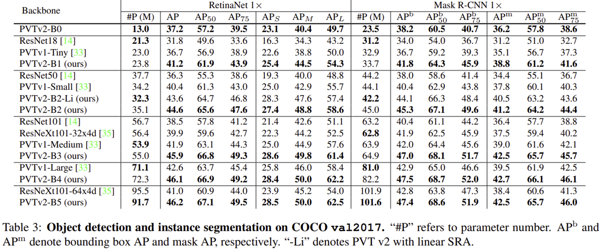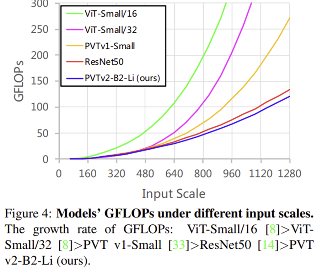 그림 1은 두 모델의 핵심 차이점인 SRA와 Linear SRA의 차이점을 보여주고 있습니다. PVT v1에서 Multi-Head Self-Attention의 복잡도에는 입력 특징 맵의 해상도가 큰 영향을 끼친다는 점을 확인하여 stride를 더 크게 잡은 convolution 계층을 도입하여 FLOPs를 줄였습니다. 하지만, 이 과정에서 Convolution operation의 복잡도가 추가로 요구되기 때문에 이를 방지하기 위한 방법으로 Linear SRA를 도입하였습니다. 이는 매우 간단하게 convolution operation을 average pooling으로 바꾸어 추가적인 파라미터와 FLOPs를 상쇄하여 Linear Complexity를 가질 수 있게 만들었습니다.