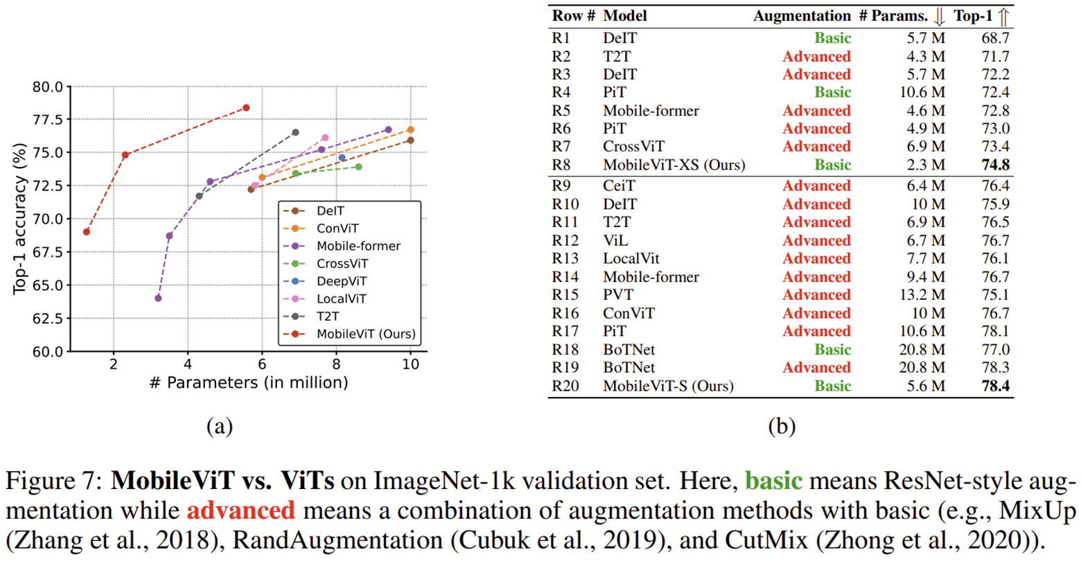 본 논문에서는 이러한 문제를 해결하기 위한 새로운 Light-weight Transformer 구조인 MobileViT를 제안합니다. 네트워크 구조적 특이점은 Convolution을 함께 사용했다는 점에 PVT와 CvT와 유사해보일 수 있겠으나 이와 함께 Transformer Block에 입력하기 전에 특징 맵을 Unfold하여 spatial correlation을 잃지않게 만들어준다는 것이 중요합니다. 또한, 다양한 Transformer 모델에서는 학습 시 Multi-Scale Training Strategy를 사용하게 되는 데 본 논문에서는 효율적인 GPU 메모리 배분을 위한 DDP 방법론도 함께 제공합니다.
