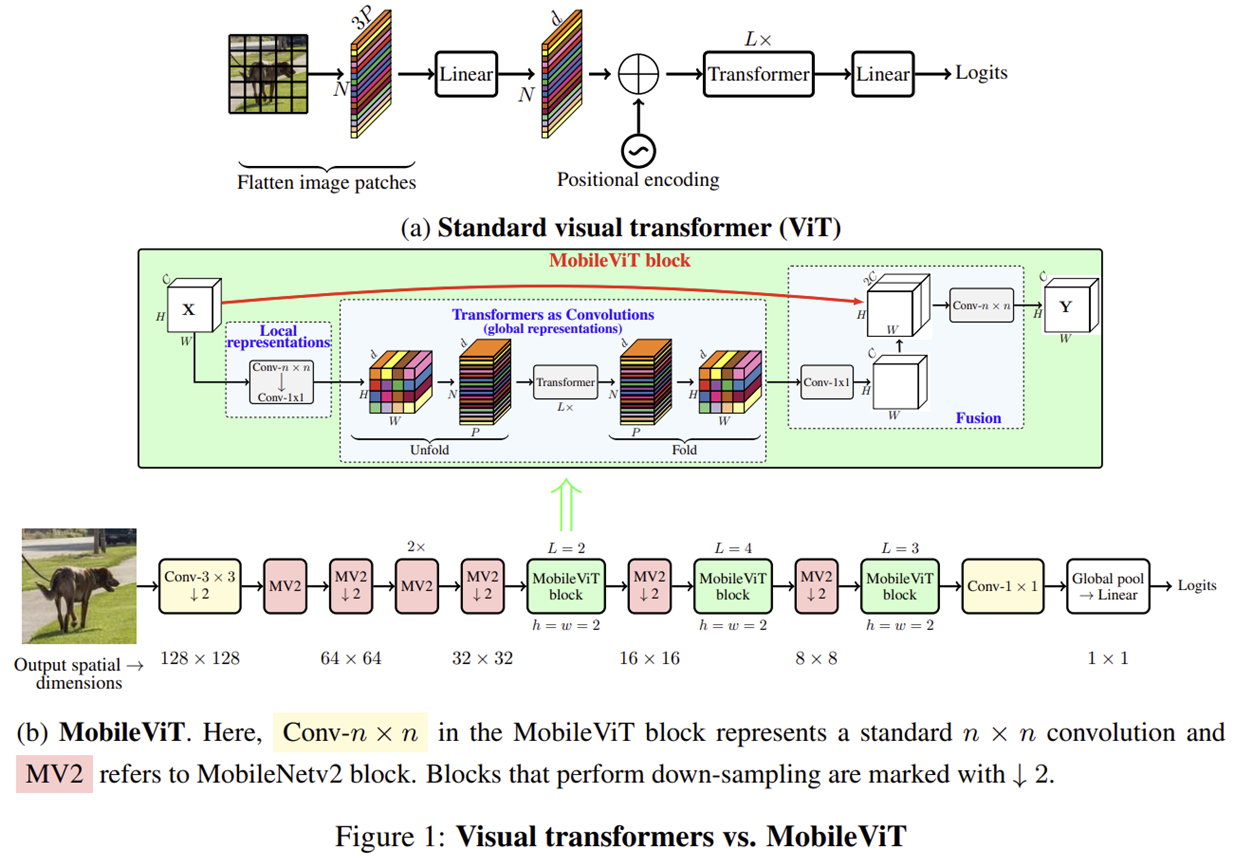 그림 1은 (a) 기존 ViT와 (b) 본 논문에서 제안하는 MobileViT 및 MobileViT Block의 전체적인 블록 다이어그램을 보여주고 있습니다. 어떤 부분에서 ViT와 달라졌는 지 차근차근 알아보도록 하겠습니다.