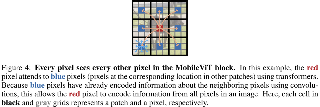 그림 4는 MobileViT의 Receptive Field를 보여주고 있습니다. 결국 해당 블록을 사용하게 되면 빨간색 픽셀을 중심으로 모든 영역을 커버하여 학습할 수 있다는 것을 알려주고 있습니다.