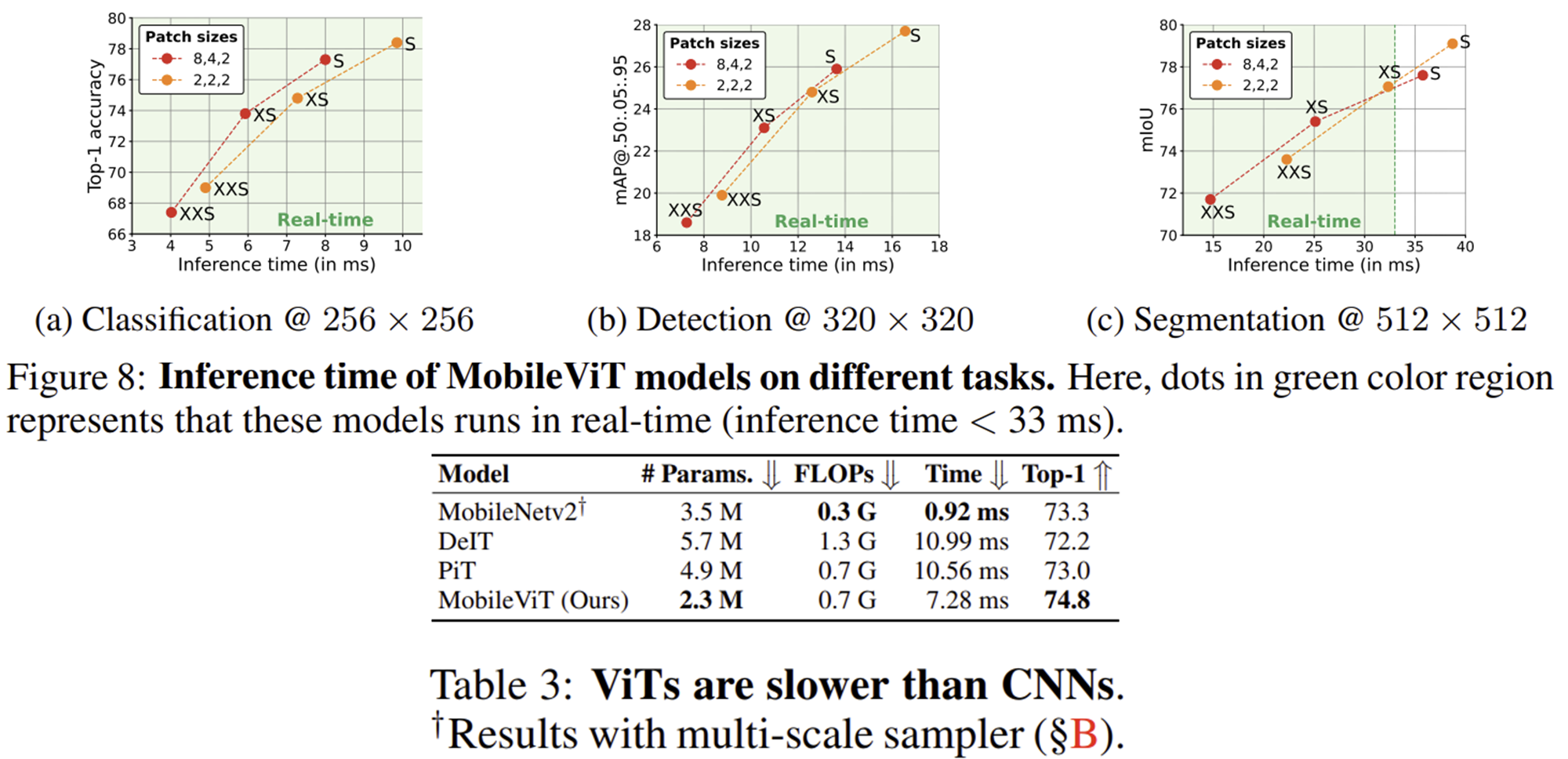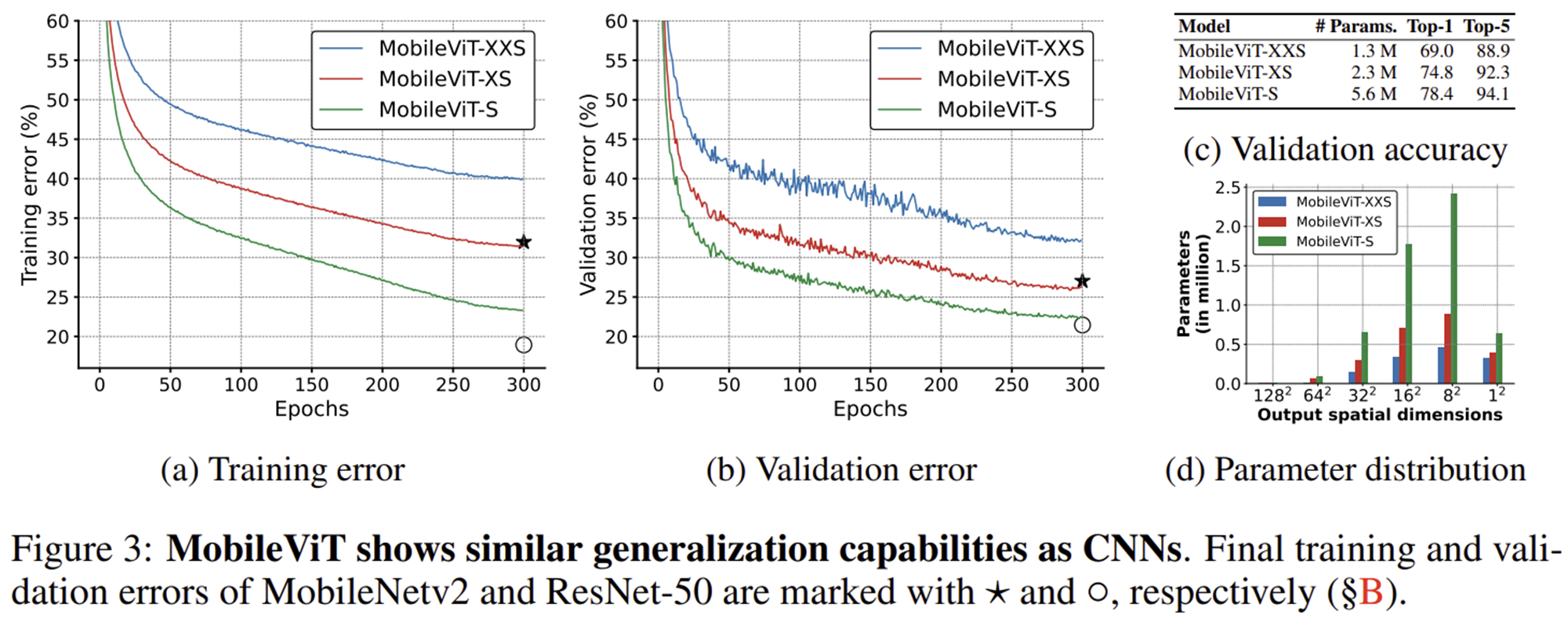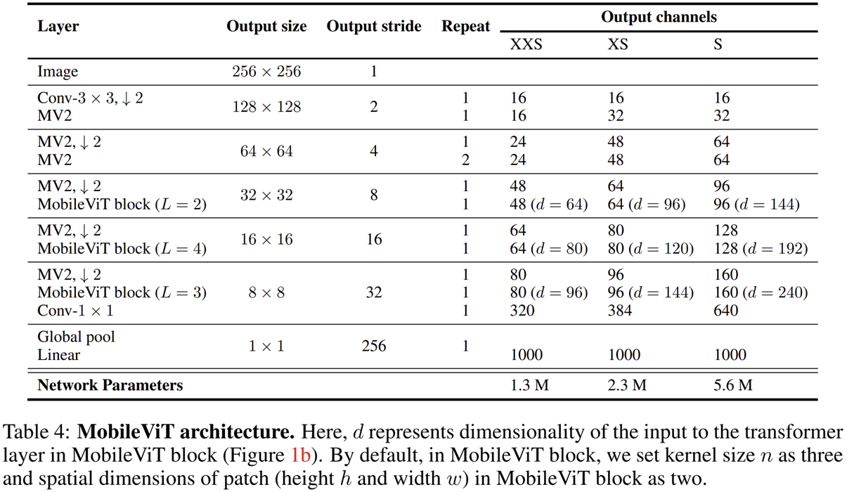 그림 1 (b)에서 볼 수 있지만 MobileViT는 모든 계층에서 MobileViT Block을 활용하지는 않았습니다. 아무래도 Transformer Block에 내재된 Self-Attention 연산이 해상도의 제곱만큼 복잡도가 요구되기 때문이겠죠. 따라서, 초기 계층에서는 MobileNetV2 (MV2)에서 사용한 블록 구조를 활용해주고 Stage 3부터 MobileViT Block을 활용하기 시작합니다. Stage 3, Stage 4, Stage 5에서는 각각 MobileViT Block을 $L = \{ 2, 4, 3 \}$번만큼 반복하여 사용한 것을 볼 수 있죠. 그리고 여타 다른 Transformer 모델과 마찬가지로 모델의 규모에 따라 MobileViT-XXS, MobileViT-XS, MobileViT-S를 설계하였습니다. 각각 달라지는 것은 내부 hidden dimension $d$를 각 Stage별로 어떻게 설정하는 지에 따라서 달라집니다. 그리고 각 스케일별 파라미터는 1.3M, 2.3M, 5.6M으로 굉장히 적은 양의 파라미터만 필요한 것을 볼 수 있죠.