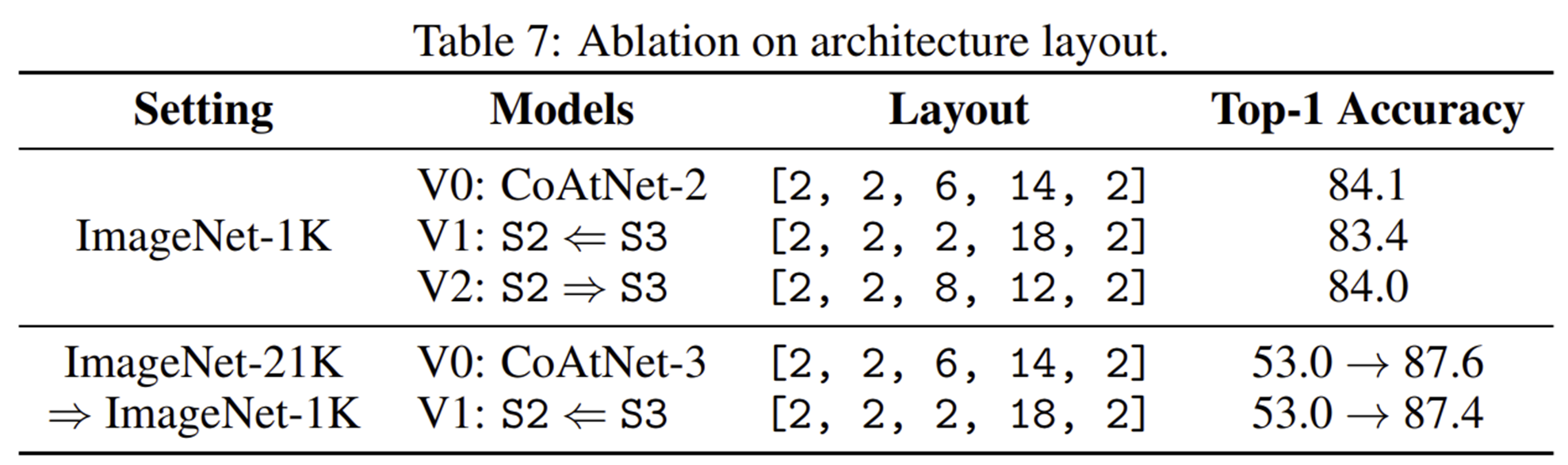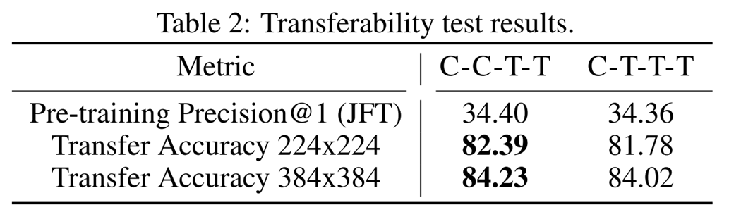 결국 $ \text{C-C-T-T} $와 $ \text{C-T-T-T} $가 Generalization ability와 Model capacity 측면에서 어느정도 성능이 있음을 확인하였습니다. 최종적으로 레이아웃을 사용할 지 결정하기 위해 Transferability를 측정하였습니다. 이는 JFT-300M에 학습된 모델을 ImageNet-1K에 fine-tuning했을 때 실험결과로 보여줍니다. 결과적으로 $ \text{C-C-T-T} $가 더 높은 성능을 가지므로 해당 레이아웃으로 다음과 같이 모델 설계을 하였습니다.