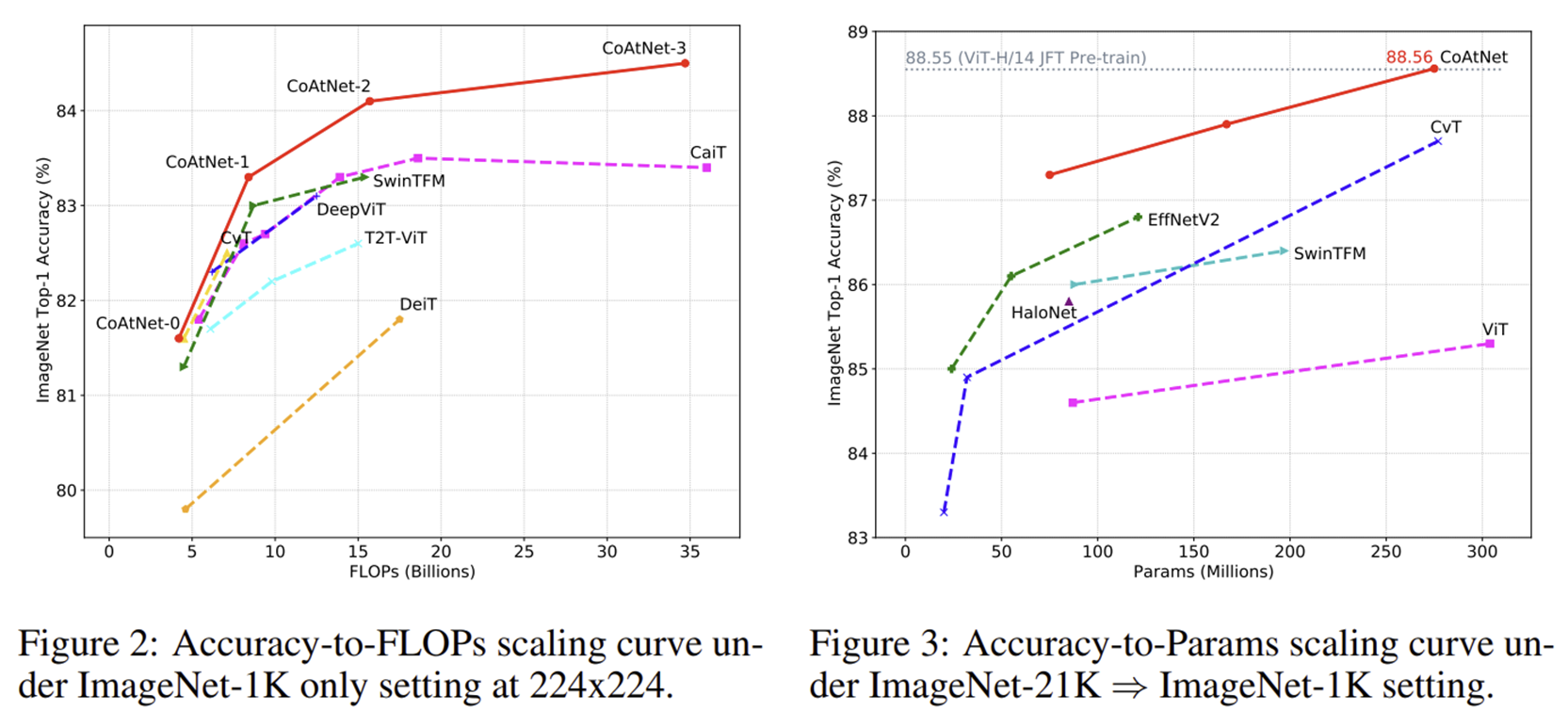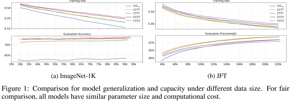 Model capacity는 대규모 데이터셋으로 훈련했을 때 얼마나 잘 fit할 수 있는지로 측정할 수 있습니다. 이를 위해 본 논문에서는 google에서만 사용할 수 있는 JFT-300M을 이용해서 실험을 진행하였습니다. 이를 기반으로 했을 때 그림 1 (b)의 결과는 다음과 같습니다.