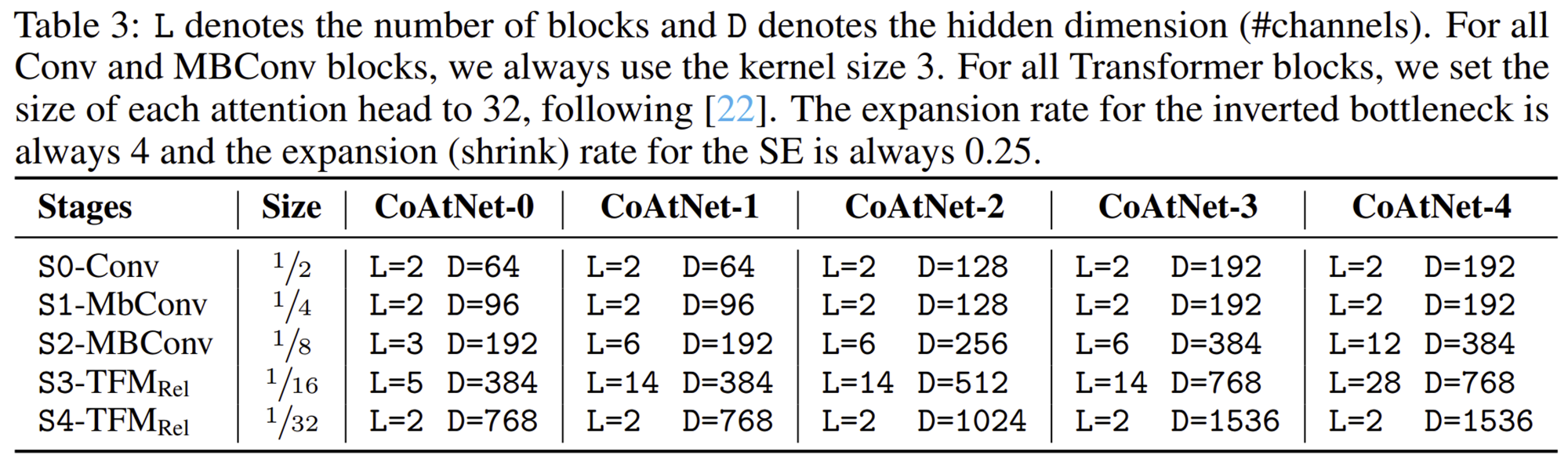 그렇다면 얼마나 downsampling을 하고 Transformer 블록을 적용하는 게 generalization ability와 model capacity 측면에서 효율적일까요? 본 논문에서는 이를 위한 실험을 진행합니다. $\text{ViT}_{\text{Rel}}$은 Relative Attention을 적용한 Transformer이라고 하겠습니다. 그리고 convolution과 Transformer를 혼합하여 사용한다고 했을 때 각 스테이지의 이름을 $S_{0}, S_{1}, S_{2}, S_{3}, S_{4}$라고 하겠습니다. 여기서 $S_{0}$는 단순히 2개의 convolution 연산으로 이루어진 Stem Block입니다. 그리고 $S_{1}$은 MBConv와 SE Block이 결합되었습니다. 나머지들 ($S_{2}, S_{3}, S_{4}$)은 MBConv 또는 Transformer로 정의됩니다. 따라서, $S_{0}$를 제외하고 작성했을 때 총 4가지의 변형 (C-C-C-C, C-C-C-T, C-C-T-T, C-T-T-T)이 존재합니다. 여기서 C는 Convolution을 사용한 경우를 의미하고 T는 Transformer를 사용한 경우를 의미합니다.