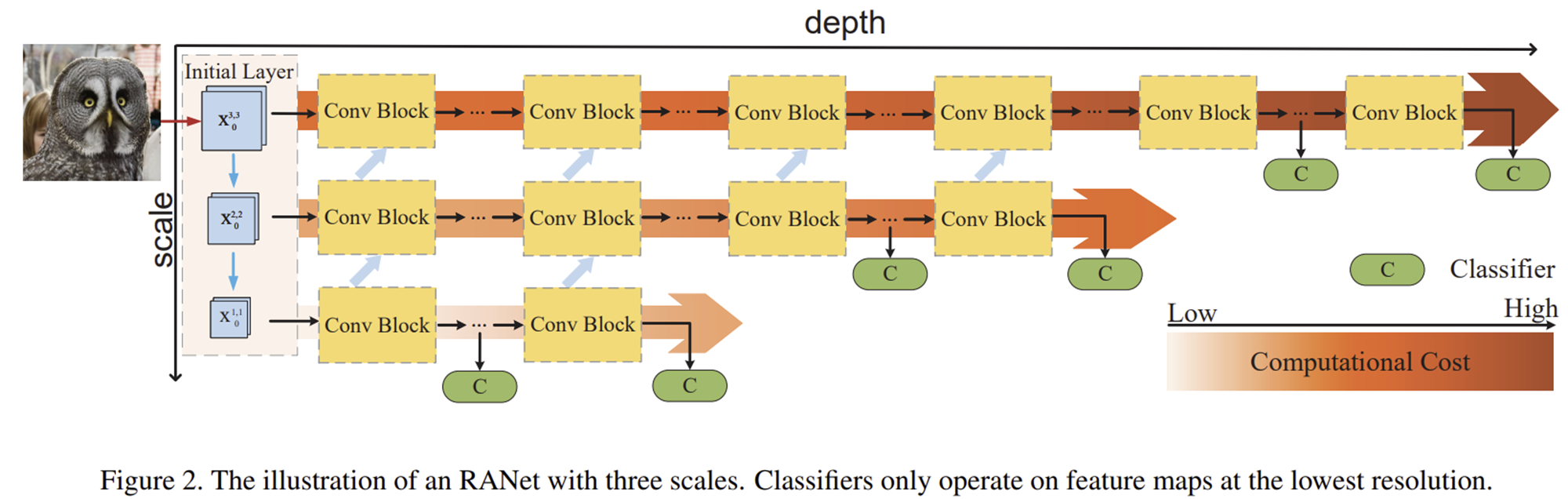 그림 2는 RANet의 전체적인 구조를 보여줍니다. 총 3개의 핵심적인 서브 모듈로 구성되어 있죠. 각각 Initial Layer, Sub-Network, Classifier입니다.