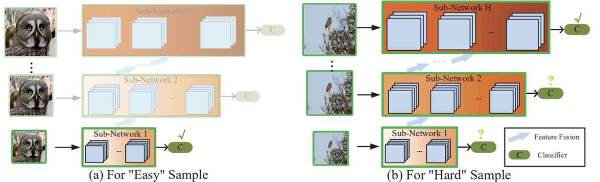 본 논문에서는 이 중에서 Adaptive Inference을 통한 효율적인 모델 설계를 수행하였습니다. 핵심은 입력 인스턴스 별로 어떤 입력이 "쉬운" 데이터 샘플이고 "어려운" 데이터 샘플 인지를 구분하는 것 입니다. 그리고 만약 쉬운 샘플이라면 더 복잡한 모델 흐름으로 적용하지 않고 그대로 출력을 내보내고 어려운 샘플이라면 더 복잡한 모델 흐름으로 연결하여 정교한 특징을 추출할 수 있도록 도와주게 됩니다. 이러한 특성은 아래의 그림에서 더욱 자세하게 볼 수 있습니다. 본 논문에서는 이러한 구조를 가진 새로운 모델 형태인 Resolution Adaptive Network (RANet)을 제안하였습니다. 이와 같은 모델의 구조는 이전의 DenseNet과 동일한 형태를 가지지만 이전 light-weight 모델과 같은 model-centric이 아닌 데이터 샘플에 집중하기 때문에 data-centric한 방법이라고 볼 수 있습니다.