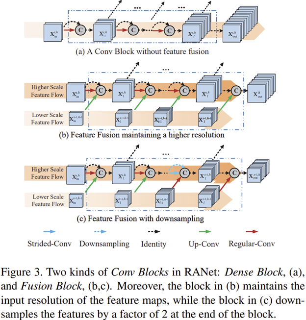 Sub-Network on Larger-scale features 해당 계층들은 낮은 해상도의 특징 맵들을 fusion하는 모듈이 포함되어 있습니다. 다만, 이 과정에서 본 논문에서는 그림 3 (b)와 (c) 같이 서로 다른 구조를 추가적으로 제안합니다. 기본적으로 두 구조 모두 입력되는 특징들을 모두 concat을 취한 뒤 convolution 연산을 하는 과정은 동일합니다. 그리고 Sub-Network $h - 1$이 총 $b_{h - 1}$개의 블록을 가지고 있다고 가정하면 Sub-Network $h$의 처음 $b_{h - 1}$개의 블록에서 fusion module이 적용됩니다. 그리고 나머지 블록들은 일반적인 Dense Block을 차용하죠. 그리고 그림 3 (b)와 (c)는 fusion module에서 연산량을 감소하기 위해 downsampling을 적용하는 지가 그 핵심차이라고 볼 수 있습니다.