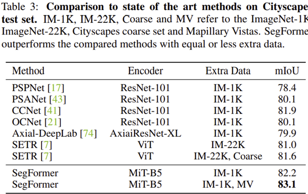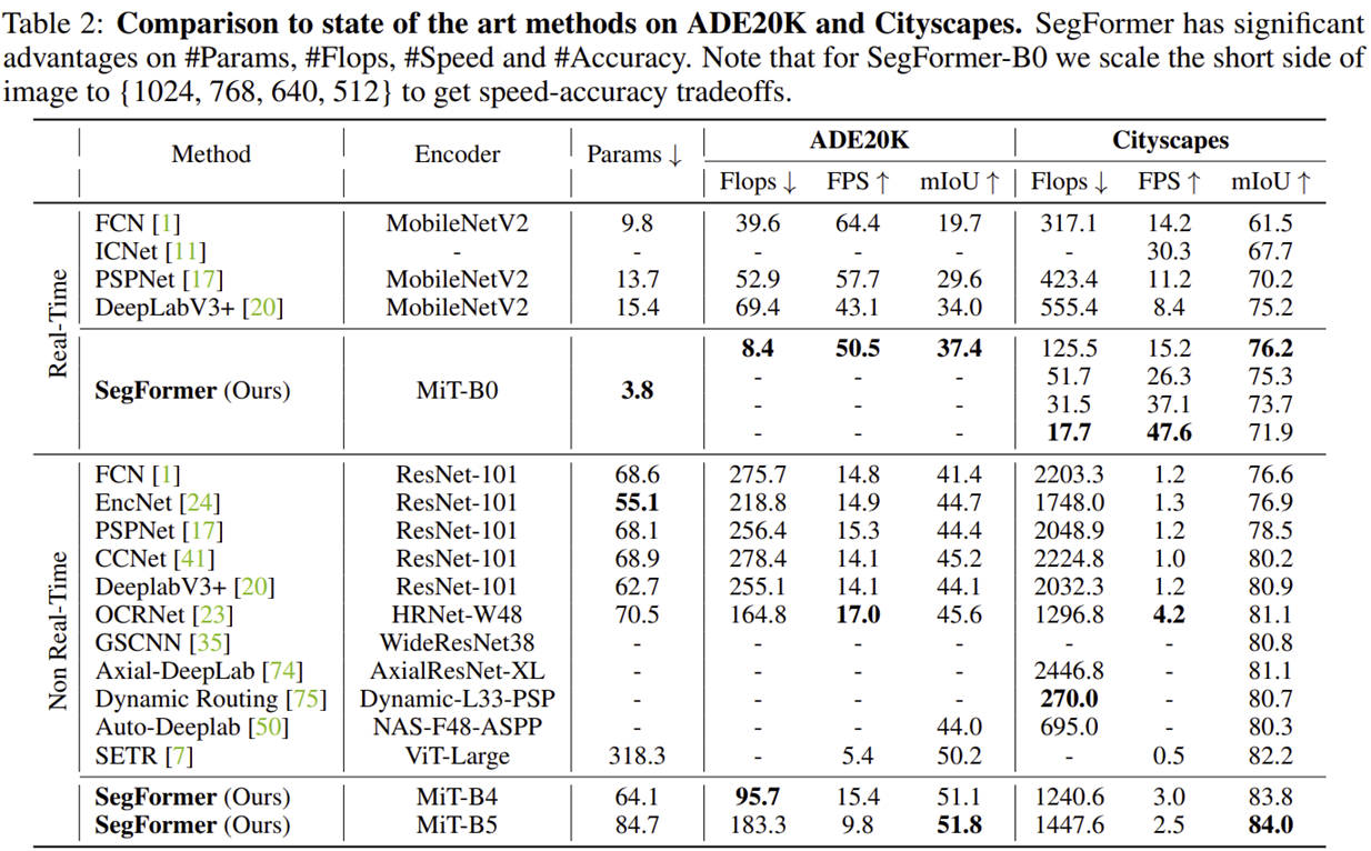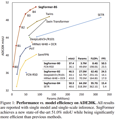 SegFormer는 그림 1에서 보이는 것과 같이 ADE20K에서 대표적인 Transformer 기반 모델인 SETR보다 훨씬 높은 정확도와 효율성을 가지는 것을 볼 수 있습니다. 뿐만 아니라 이후 실험에서는 CityScapes와 COCO-Stuff에서도 높은 성능을 달성하였습니다.