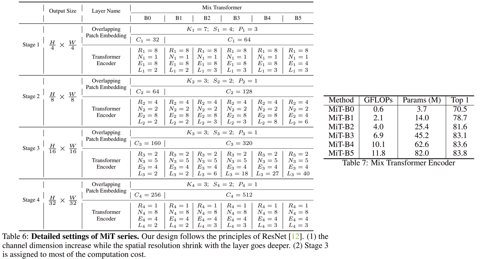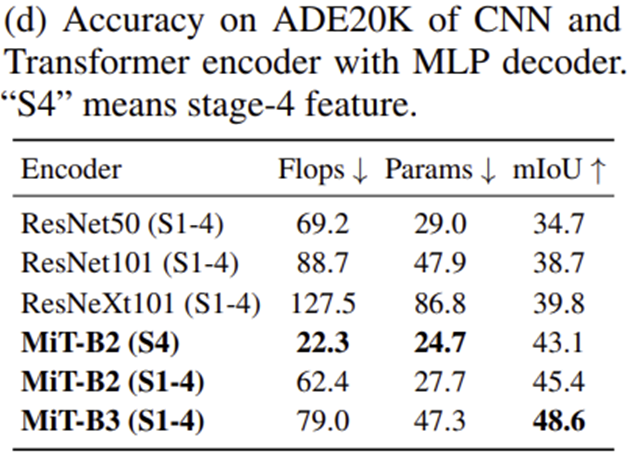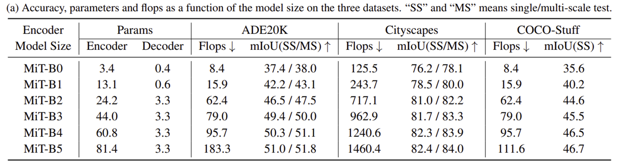 본 논문에서는 Mix Transformer (MiT)라는 새로운 Transformer 인코더를 설계하였습니다. MiT-B0 ~ MiT-B5까지 6개의 모델 변형 구조로 구성되어 있으며 모두 동일한 구조이며 전체적인 규모만 다릅니다. 즉, MiT-B0를 인코더로 사용하는 SegFormer는 속도는 빠르지만 정확도는 떨어지게 되고 반대로 MiT-B5를 인코더로 사용하는 SegFormer는 속도는 느리지만 정확도를 향상될 것 입니다. 따라서 본인의 어플리케이션 및 컴퓨팅 자원 환경에 맞추어 사용하면 되겠네요.