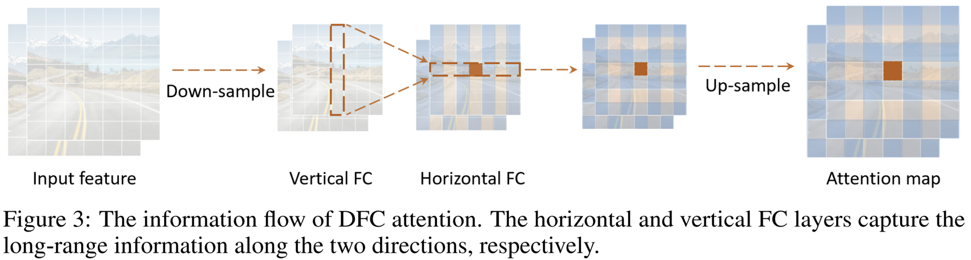이를 위해 그림 3과 같이 다운샘플링을 수행한 뒤 FC layer를 적용할 때 vertical/horizontal FC를 따로 분해하여 attention을 수행해주는 방식을 채택합니다.