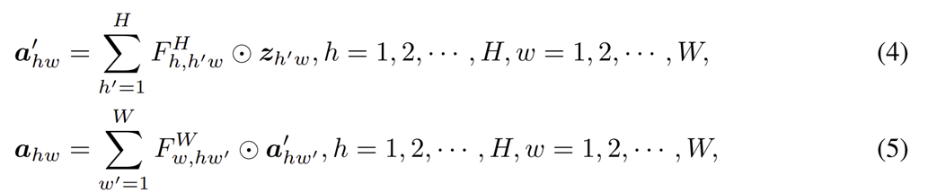 $$a_{hw} = \sum_{h^{'}, w^{'}} F_{hw, h^{'}w^{'}} \odot z_{h^{'}w^{'}}$$