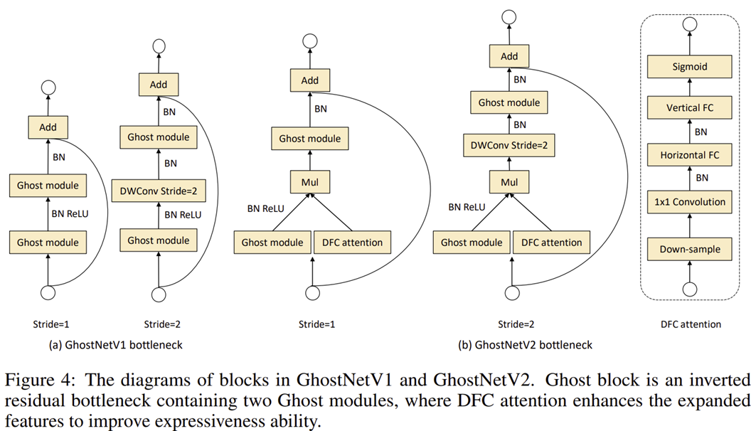 그림 4는 GhostNetV1과 GhostNetV2 사이의 비교를 보여주고 있습니다. 두 모듈의 핵심적인 차이는 DFC Attention의 유무로 입력 특징 맵은 Ghost Module과 DFC Attention에 각각 입력되어 element-wise multiplication을 취한 뒤 다시 Ghost Module을 통과하여 연산이 수행되죠.