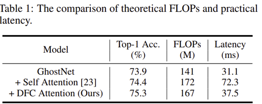 본 논문에서는 간단한 실험으로 MobileViT에서 사용된 self-attention을 GhostNet에 그대로 적용하여 분석해봅니다. 그 결과 성능은 실제로 0.5%로 미세하게 향상되지만 Latency가 거의 2배 정도 크게 증가한 것을 볼 수 있습니다. 이는 long-range dependency의 중요성을 강조하면서 self-attention의 복잡도 이슈도 함께 보여주고 있습니다. 하지만, 잠시 뒤 설명드릴 본 논문에서 제안하는 DFC Attention을 적용하면 성능도 1.4% 향상되면서 Latency도 self-attention과 비교했을 때 크게 증가하지 않는 것을 볼 수 있죠.