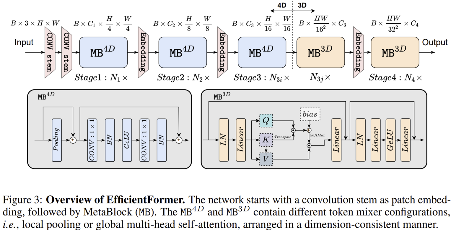 EfficientFormer는 그림 3에서 보이는 것과 같이 4D partition과 3D partition을 나누어져 있습니다. 그리고 4D partition에서는 CONV-Net Style을 주로 사용하고 3D partition에서는 linear projection과 attention mechanism을 주로 이용하게 됩니다. 이때, Reshape 연산 사용을 최소화하기 위해서 처음에는 4D parition으로 시작하다가 마지막 스테이지에서만 3D partition을 사용합니다.