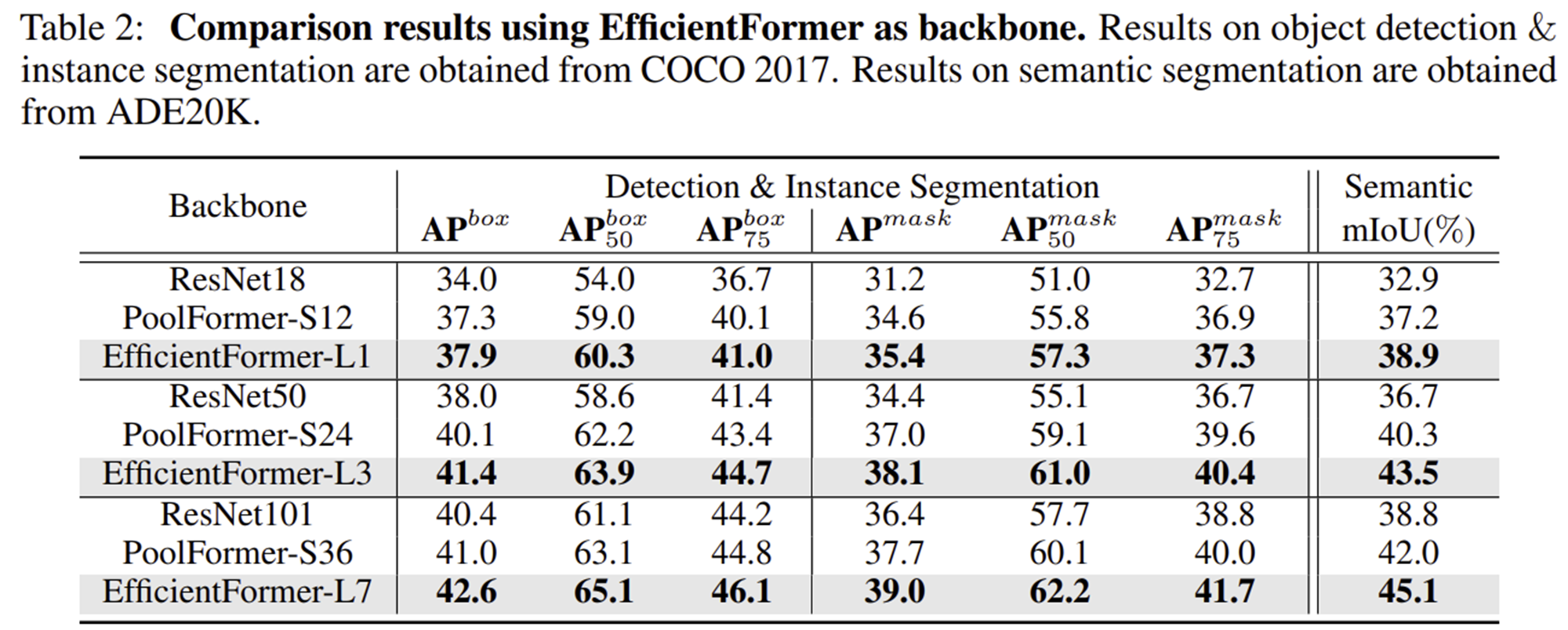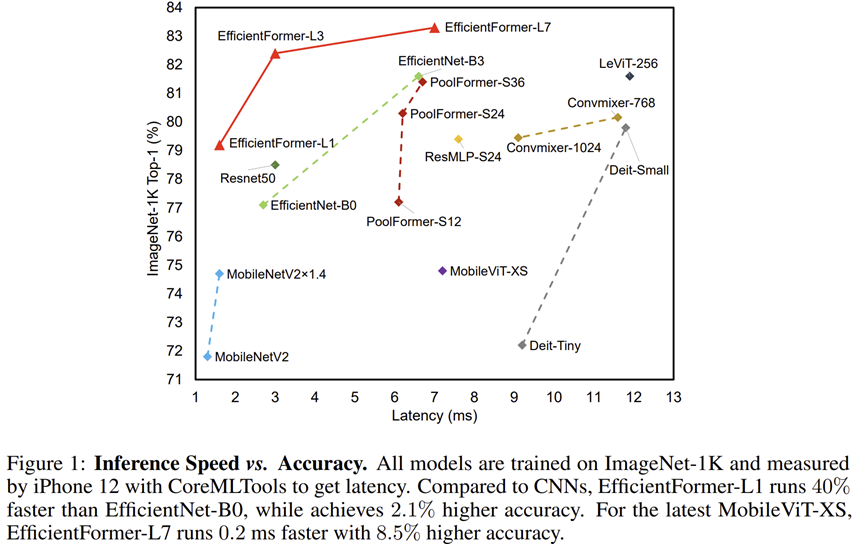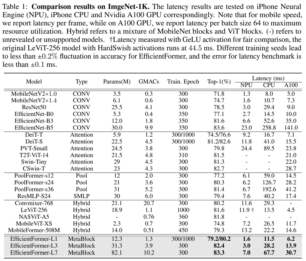 설계된 모델인 EfficientFormer들은 실제로 저희가 지금까지 보았던 모델들과 비교했을 때 훨씬 적은 latency임에도 불구하고 높은 정확도를 가지는 것을 볼 수 있죠. 특히, MobileViT와 비교했을 때 0.2 ms 속도가 더 빨라졌지만 8.5%나 더 높은 성능을 달성하였습니다. 그리고 MobileNetV2과도 비교했을 때 거의 동일한 latency임에도 불구하고 4~5%의 성능 향상을 달성한 것을 볼 수 있습니다.