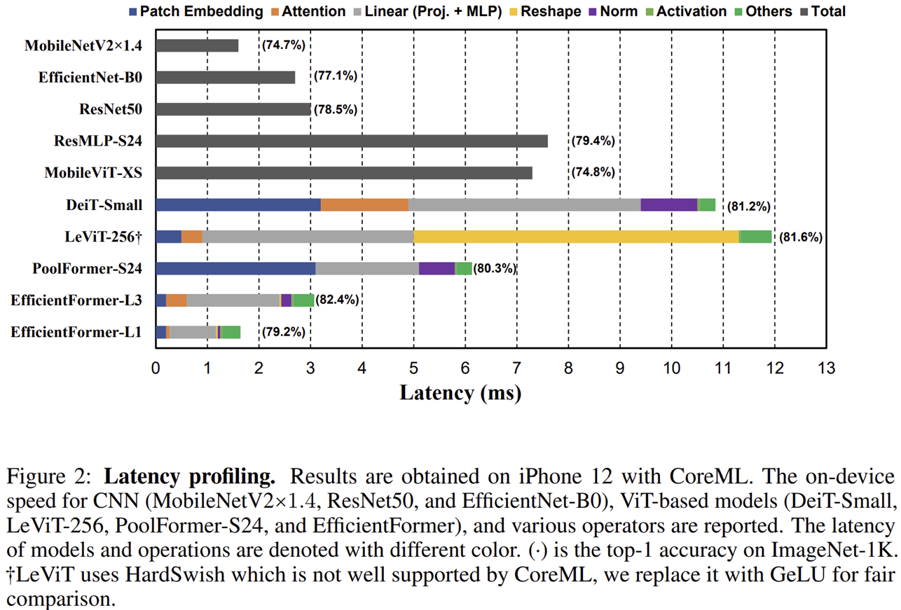 일반적으로 ViT 관련 모델들에서는 공통적으로 patch embedding 자체는 크게 연산량을 요구하지 않는다는 이야기를 하였습니다 (ViT, MetaFormer). 하지만, DeiT vs. PoolFormer 그리고 LeViT vs. EfficientFormer를 확인해보면 patch embedding이 mobile에서 생각보다 높은 연산량이 요구되는 것을 볼 수 있습니다.