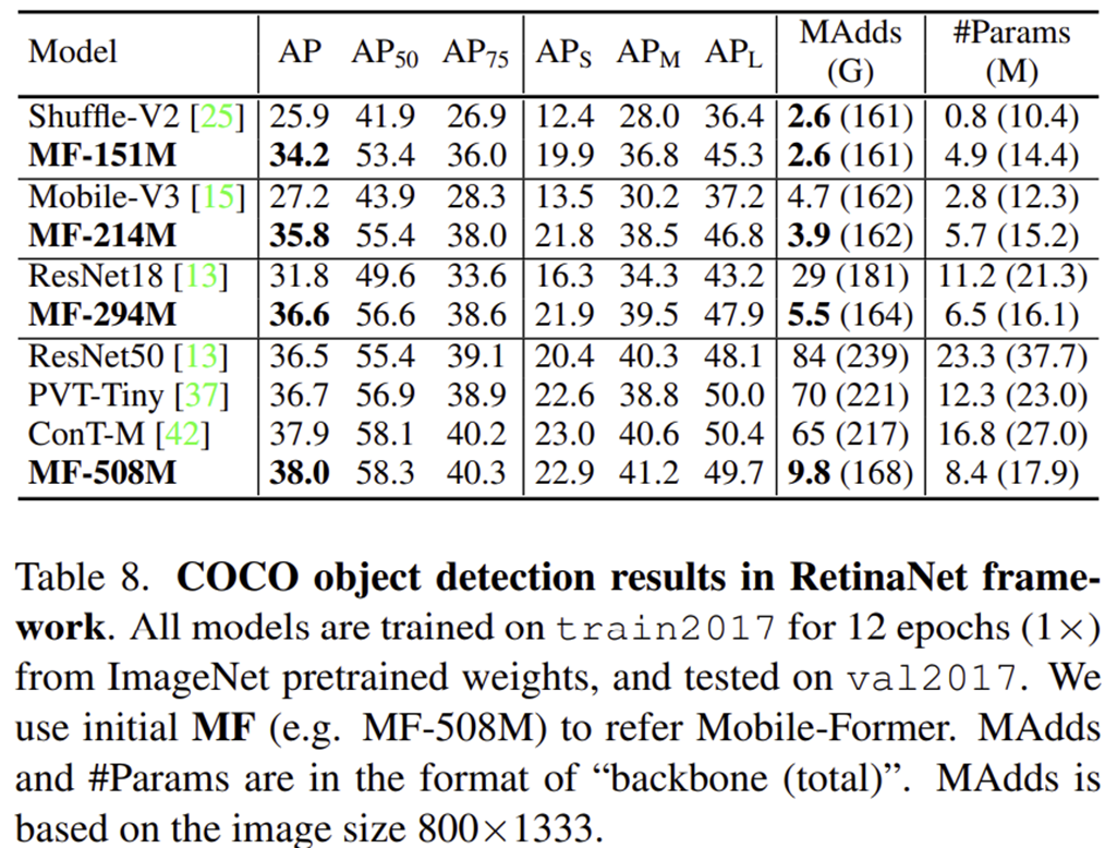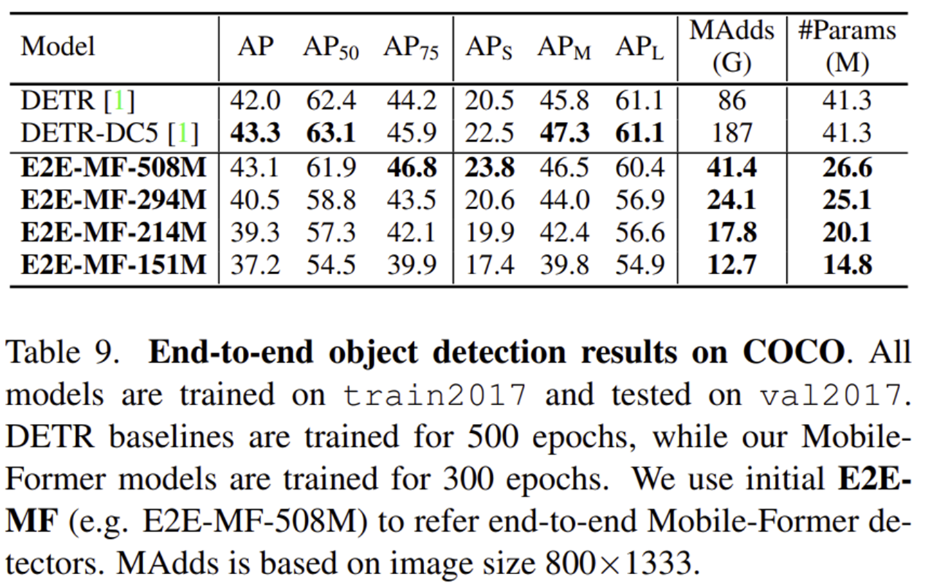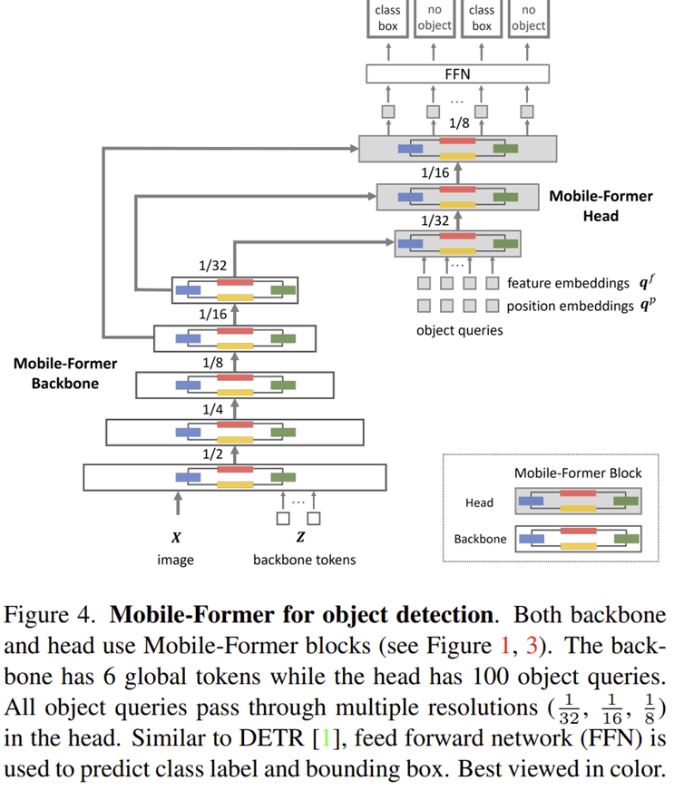 또한, Mobile-Former를 이용해서 그림 4와 같이 Object Detection을 위한 구조도 설계하였습니다. 이는 DETR과 동일한 형태로 설계되었습니다.