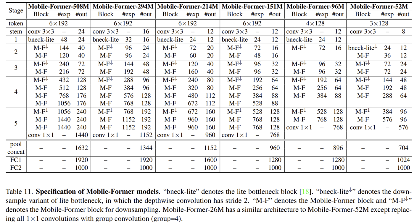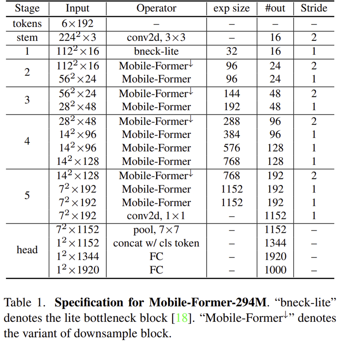 Mobile-Former의 가장 중요한 특징은 기존의 LeViT와 같이 Series Structure가 아닌 Parallel Structure로 모델을 설계했다는 점 입니다. 각각 MobileNet과 Transformer를 병렬화하여 구성한 것을 볼 수 있죠. 여기서 Mobile Stream에서는 입력 영상 $\mathbf{X} \in \mathbb{R}^{H \times W \times 3}$을 받아 MobileNet의 핵심 블록은 inverted bottleneck block에 넘겨주게 됩니다. 그리고 Former Stream에서는 입력 영상이 아닌 learnable token $\mathbf{Z} \in \mathbb{R}^{M \times d}$가 입력됩니다. 여기서 $M$과 $d$는 각각 토큰의 개수와 차원의 크기를 의미합니다. 이때, 기존의 ViT와는 다르게 굉장히 적인 양의 토큰을 사용하여 학습을 진행하기 때문에 해당 learnable token에 입력 영상 $\mathbf{X}$의 global prior를 효율적으로 추출할 수 있게 됩니다.