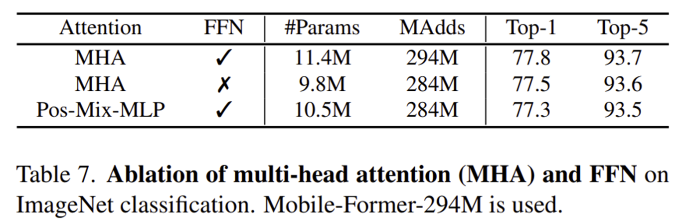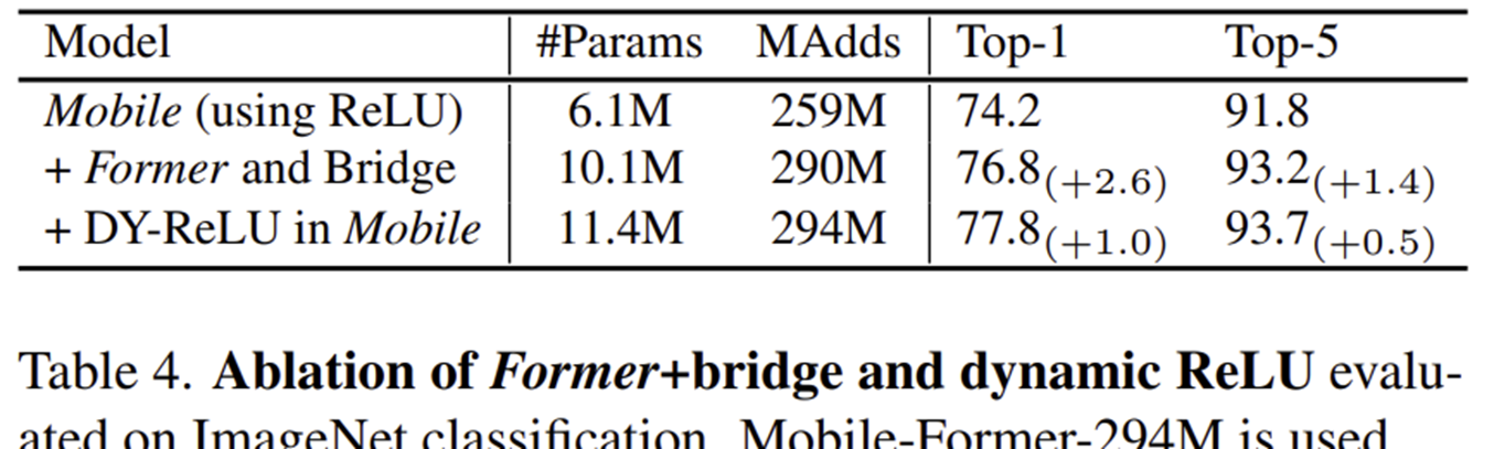 Mobile-Former에서는 기존의 MobileNet에서 사용하는 inverted bottleneck 구조에서 ReLU가 아닌 Dynamic ReLU라는 새로운 activation function을 도입하여 학습을 진행하였습니다. 그리고 Former Block은 흔히 Transformer에서 사용되는 MHSA와 FFN으로 구성된 Block으로 사용되는 것을 볼 수 있습니다.