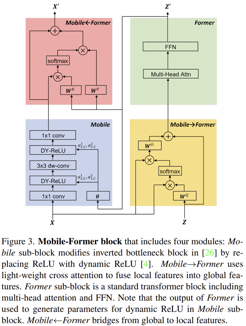 Mobile-Former의 전체적인 스킴은 그림 1에서도 볼 수 있었습니다. 그림 3은 이를 좀 더 자세하게 표현한 그림입니다. 일단, 전체적으로 총 4개의 핵심 모듈로 구성되어 있는 것을 관찰할 수 있습니다.