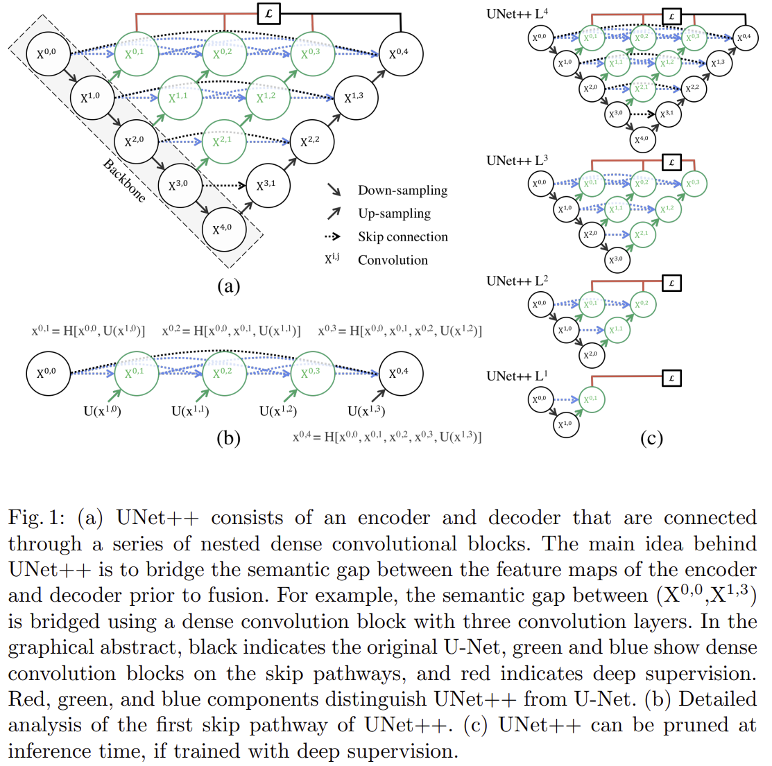 이러한 과정을 통해, UNet++의 스킵 연결은 각 노드에서 이전 단계와 하위 단계의 특징을 점진적으로 결합하여, 디코더에 전달될 때까지 점차적으로 의미론적으로 풍부한 특징 맵을 생성합니다. 또한, 이 수식 표현은 UNet++가 인코더의 저수준 특징(low-level features)을 디코더의 고수준 특징(high-level features)과 보다 의미적으로 일관성 있게 결합할 수 있도록 설계된 원리를 명확히 보여줍니다.