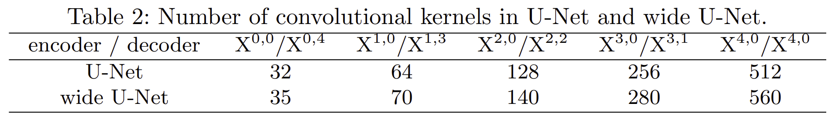 표 2는 본 논문에서 성능을 비교하는 baseline model들의 셋팅입니다. UNet++의 성능을 객관적으로 평가하기 위해 두 가지 기준 모델(baseline)을 사용하여 성능을 비교하였습니다. 선정된 두 모델은 Original U-Net과 Wide U-Net입니다.