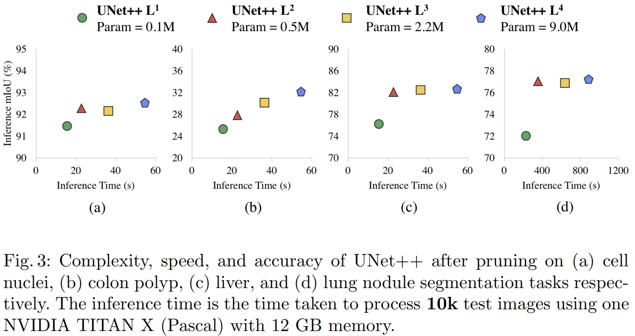 UNet++는 깊은 지도학습(Deep Supervision)을 이용해 필요에 따라 네트워크 구조를 축소(가지치기, pruning)할 수 있는 장점을 제공합니다. 위의 실험 결과는 서로 다른 수준으로 가지치기한 UNet++의 성능과 추론 속도(Inference Time)를 네 가지 의료 영상 세분화 데이터셋에 대해 분석한 것입니다.