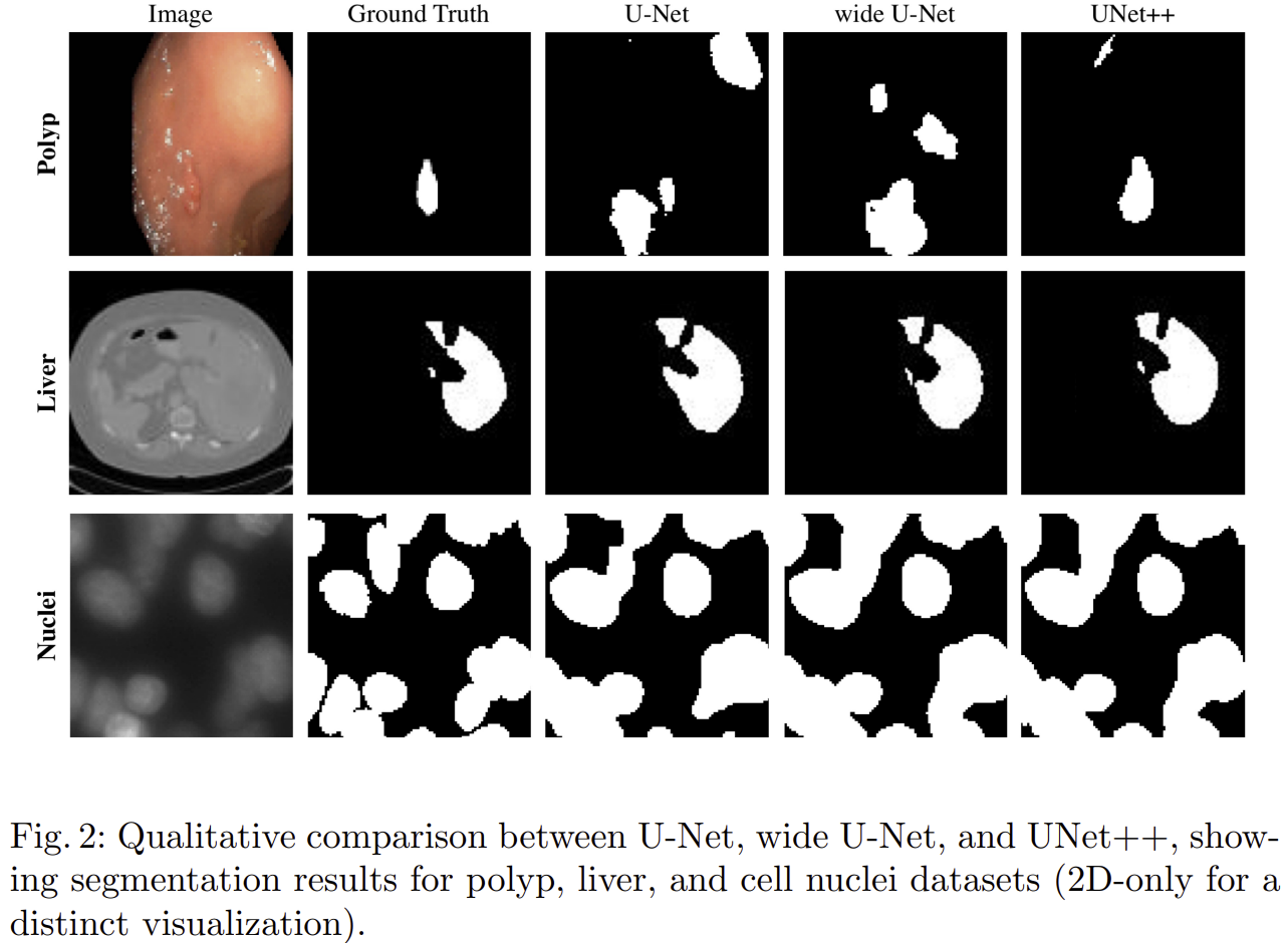 - 폐결절, 결장 용종, 간, 세포핵 등 서로 다른 특성과 크기를 가진 의료 영상 데이터 세트에서 UNet++는 기존 U-Net 및 Wide U-Net 대비 평균 IoU 기준 각각 3.9점과 3.4점의 유의미한 성능 향상