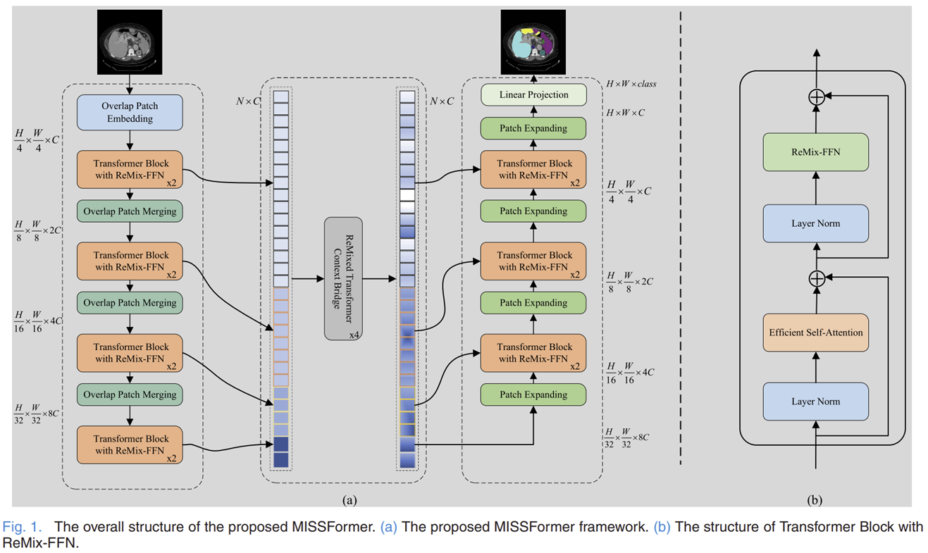 그림 1은 본 논문에서 제안하는 MISSFormer의 전체적인 구조입니다. 그림에서 볼 수 있는 것과 같이 MISSFormer는 의료 이미지 분할 작업에 특화된 계층적 U자형 Transformer 기반 모델입니다. MISSFormer는 크게 Encoder, ReMixed Transformer Context Bridge, 그리고 Decoder로 구성되어 있으며, 각 단계를 크게 4단계로 나누면 다음과 같은 과정을 거쳐 동작합니다.