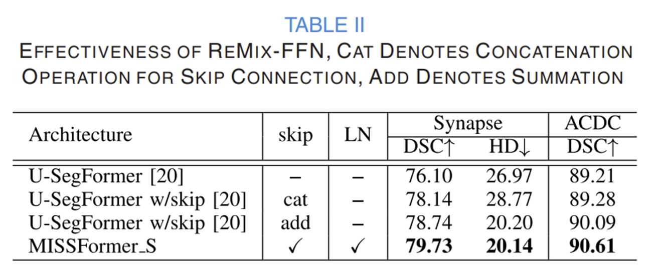 - ACDC 데이터셋에서 ReMix-FFN을 사용한 MISSFormer가 DSC 91.19로 모든 비교 모델 중 가장 뛰어난 성능을 보였습니다.