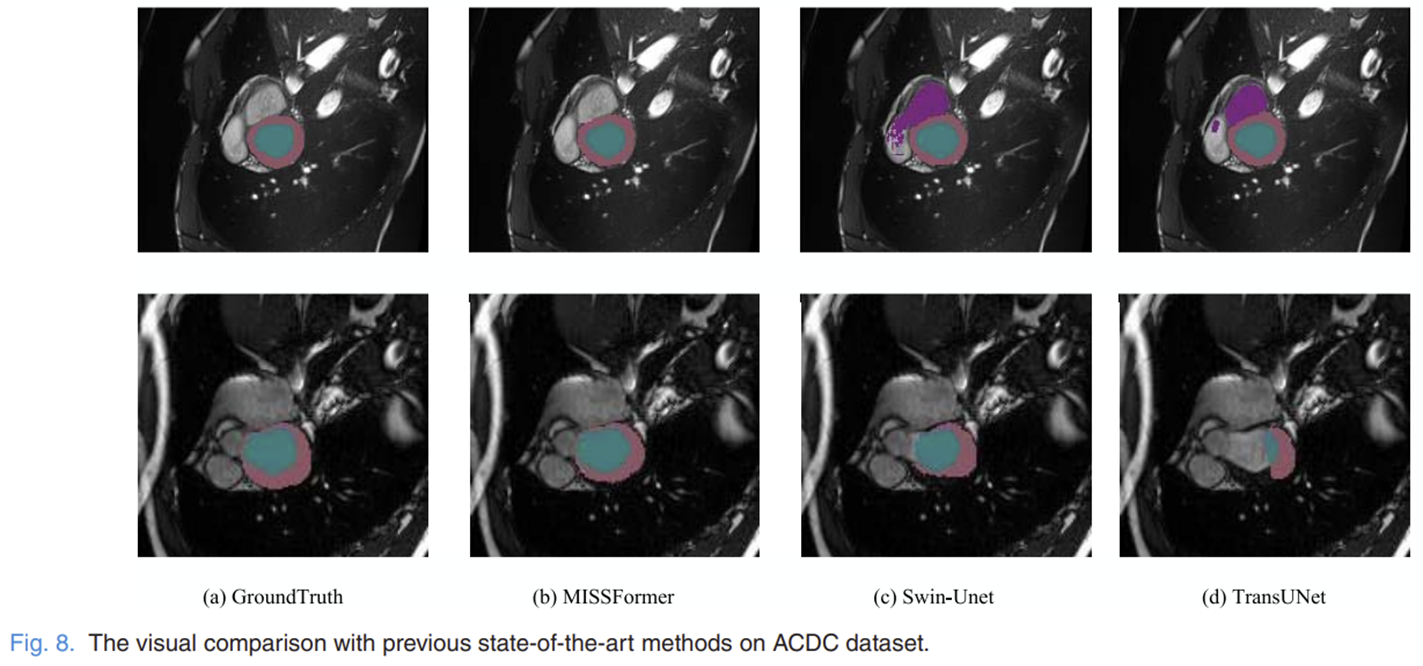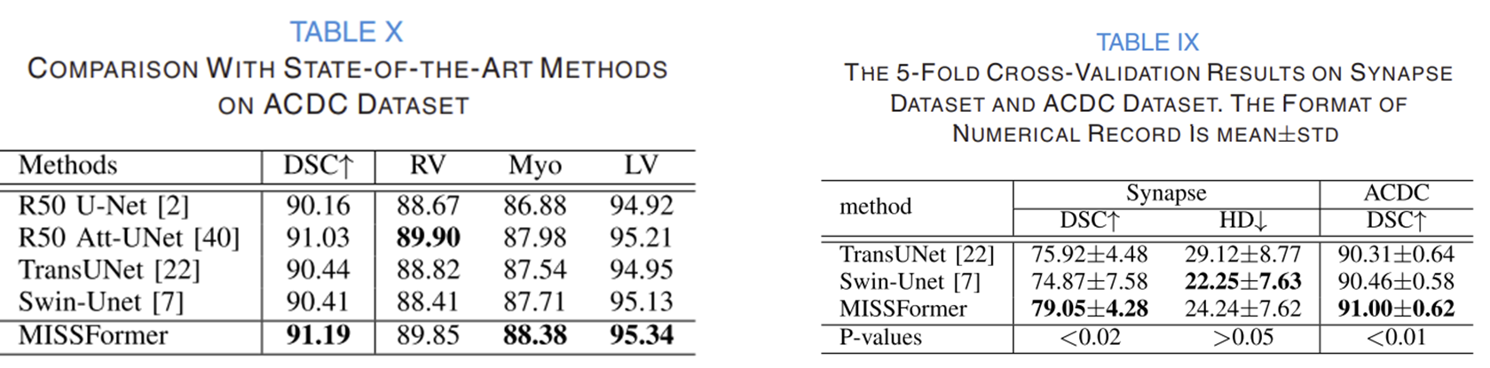 - ACDC 데이터셋에서 MISSFormer_S가 90.61의 DSC를 기록하며 다른 모델들보다 명확히 높은 성능을 나타냈습니다.
