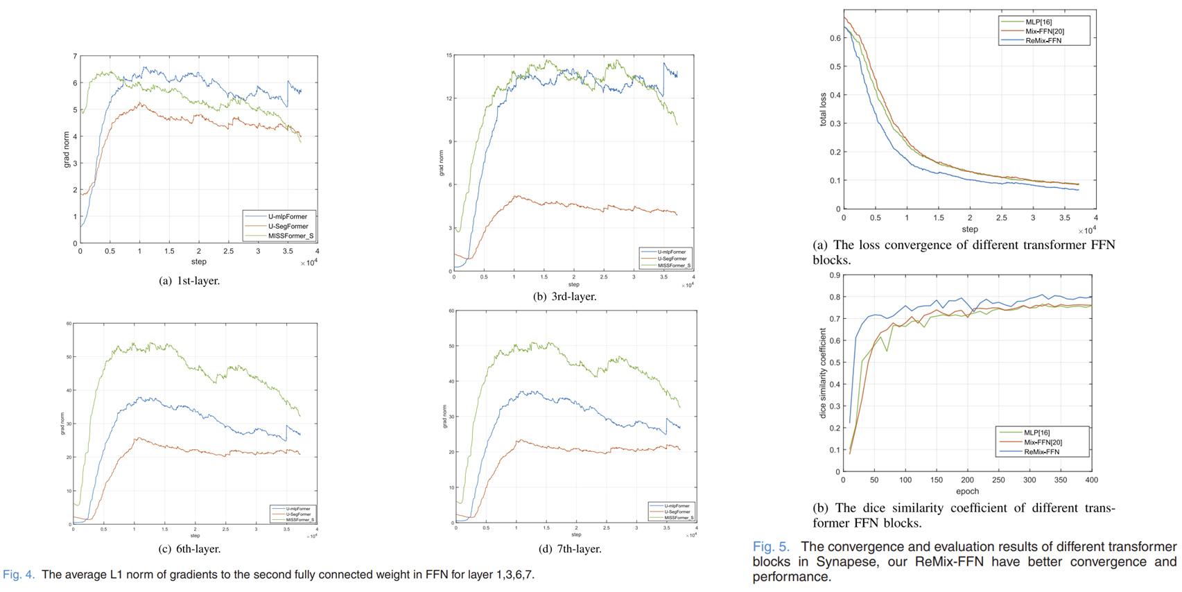 - Dice Similarity Coefficient(DSC)의 수렴 속도와 최종 값 또한 ReMix-FFN이 가장 우수한 성능을 보였습니다.