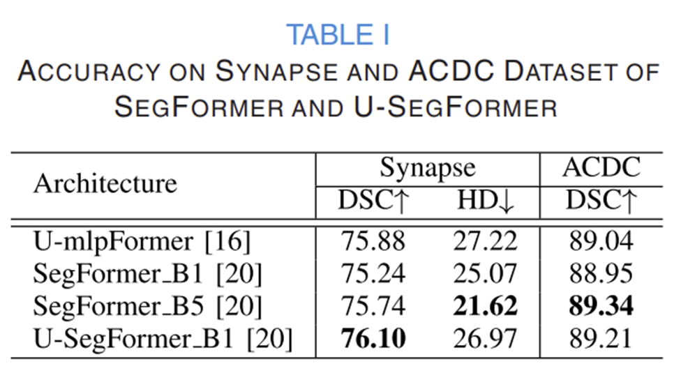 이를 통해 기존 모델 중에서는 Synapse에서는 U자형 Transformer 구조(U-SegFormer)가 더 좋은 성능을, ACDC에서는 SegFormer의 깊은 구조(SegFormer_B5)가 우수한 성능을 보인다는 것을 확인할 수 있습니다.