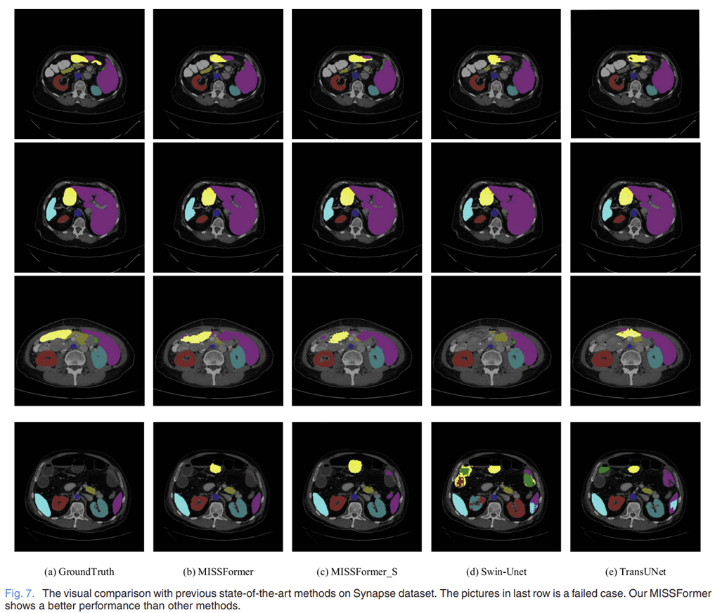 - Synapse 데이터셋에서 MISSFormer_S가 DSC는 79.73으로 가장 높고, HD는 20.14로 가장 낮아 다른 모든 모델(U-mlpFormer, U-SegFormer, U-LocalViT)보다 우수한 성능을 보였습니다.