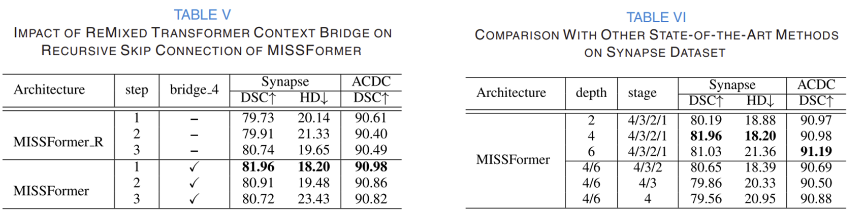 - Synapse 데이터셋에서 Context Bridge가 추가된 MISSFormer는 DSC가 최대 81.96으로 증가했고, HD가 최소 18.20까지 감소하여 성능이 크게 개선되었습니다 (Table 5). 가장 우수한 결과는 depth=4, stage=(4/3/2/1) 구조로 구성된 경우였으며, DSC=81.96, HD=18.20을 기록했습니다 (Table 6).