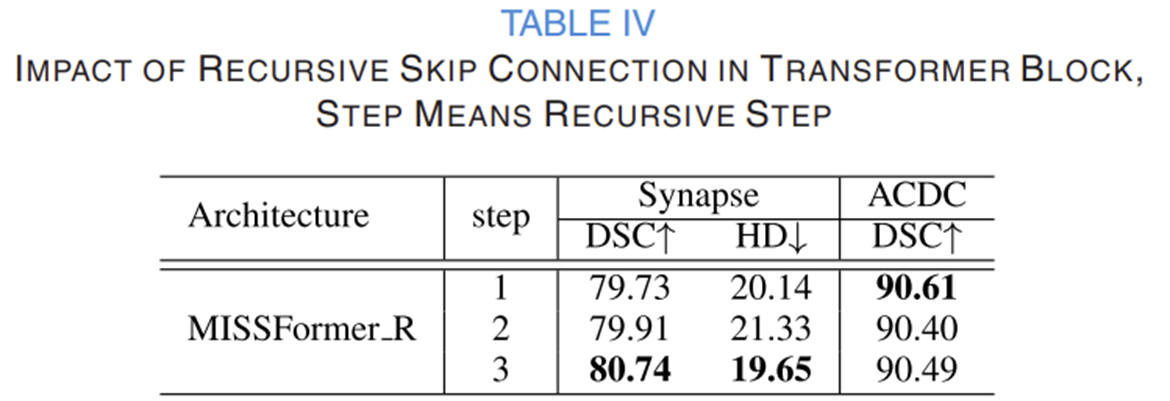 - ACDC 데이터셋에서 Recursive step이 1일 때 DSC가 90.61로 가장 좋았고, step이 증가할수록 성능이 다소 감소하는 경향을 보였습니다.