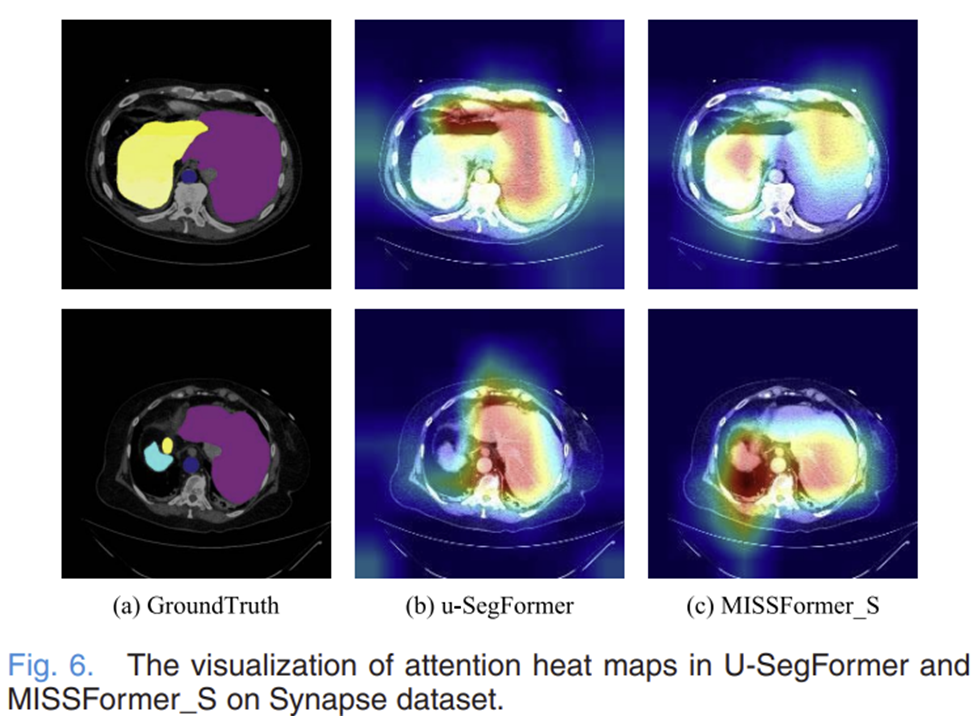 - Synapse 데이터셋에서 가장 높은 DSC 점수는 U-SegFormer_B1이 76.10으로 가장 우수했고, HD는 SegFormer_B5가 21.62로 가장 우수했습니다.