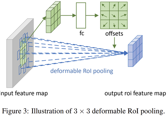 하지만 이러한 고정된 방법은 객체의 다양한 형태나 크기에 잘 대응하지 못하는 단점이 있습니다. 이에 그림 3과 같이 Deformable RoI Pooling은 기존 RoI Pooling에서 각 bin의 위치에 데이터에 따라 학습 가능한 2차원 오프셋을 추가하여, RoI 내의 픽셀 샘플링 위치를 객체의 형태와 크기에 따라 동적으로 조정할 수 있게 합니다.