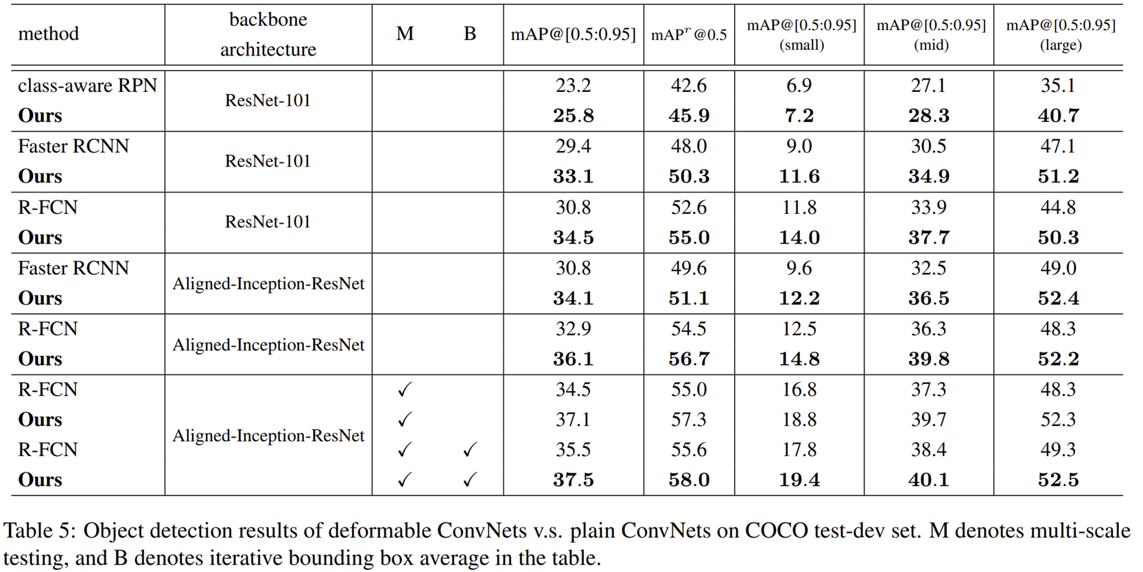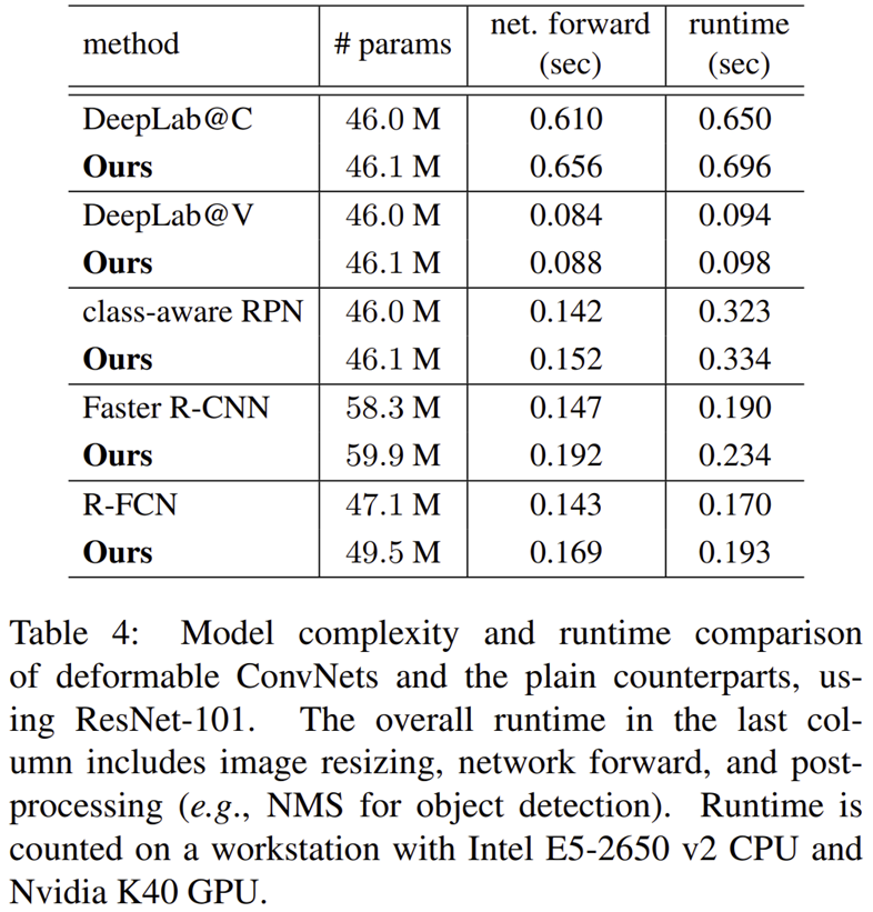 - Deformable ConvNets 모델은 기존 모델(DeepLab, class-aware RPN, Faster R-CNN, R-FCN)에 비해 전체적인 파라미터 수(# params)는 약간 증가하였으나, 그 차이는 매우 작습니다 (약 0.1M~2.4M 증가).