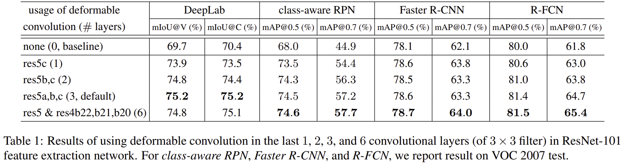 실험은 ResNet-101 기반 네트워크에서 Deformable Convolution을 사용하는 층의 수를 변경하면서 DeepLab(의미론적 분할), class-aware RPN, Faster R-CNN, R-FCN(객체 탐지) 네 가지 작업에서 성능 변화를 측정한 것입니다.