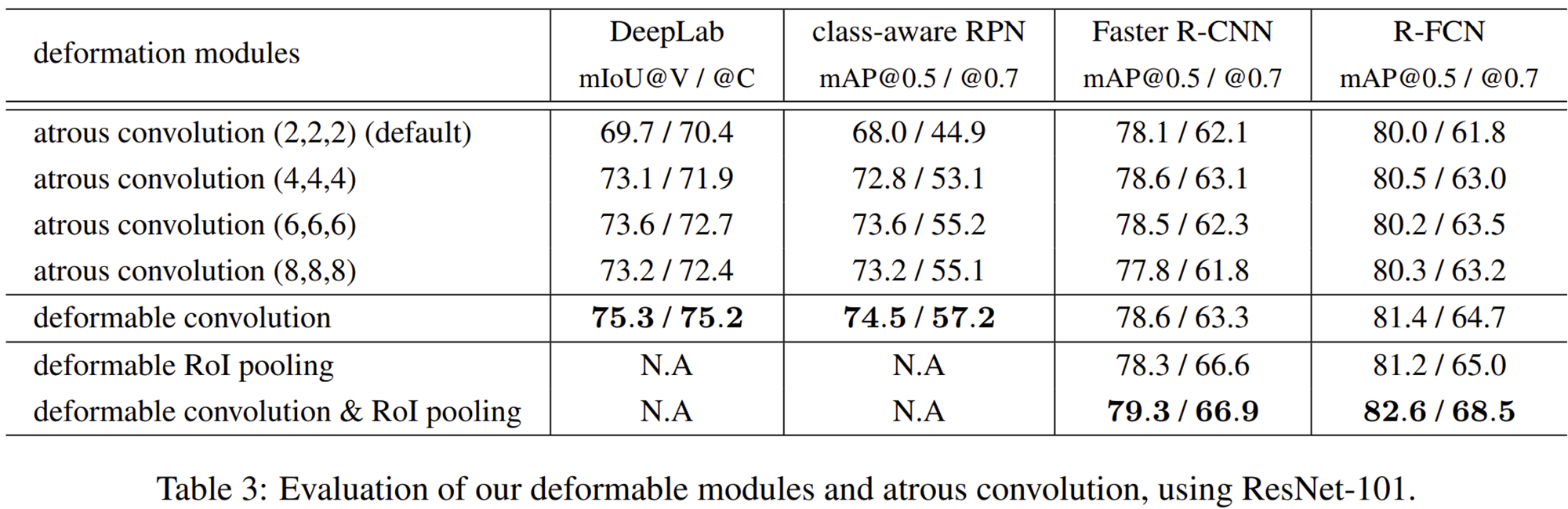 - Deformable convolution은 고정된 dilation 값을 사용한 atrous convolution보다 모든 태스크(DeepLab, class-aware RPN, Faster R-CNN, R-FCN)에서 우수한 성능을 보입니다. 특히 DeepLab에서 atrous convolution 대비 약 1.7~5.6%의 뚜렷한 성능 향상이 있었습니다.
