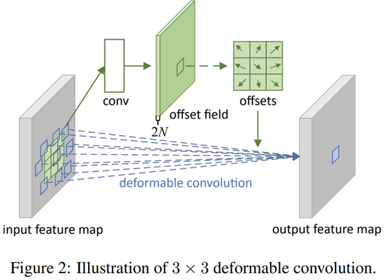 여기서, 오프셋 $\Delta \mathbf{p}_{n}$ 은 입력 특성 맵에 별도의 작은 컨볼루션 층을 추가로 적용하여 학습됩니다. 이 오프셋 값은 일반적으로 정수가 아닌 실수 값을 가지기 때문에, 입력 특성 맵에서 값을 얻을 때는 주변 픽셀들로부터 보간(interpolation)을 수행해야 합니다.