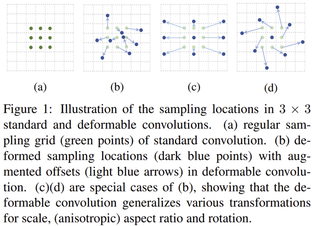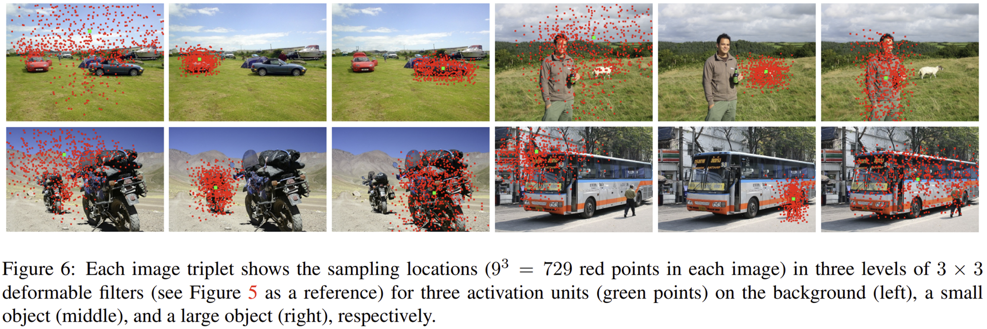 Deformable ConvNets는 객체의 크기와 위치에 따라 수용 필드(receptive field)를 동적으로 조정하여 중요한 영역을 효과적으로 탐지할 수 있도록 합니다. 위 그림을 보면 작은 객체, 중간 크기 객체, 큰 객체 및 배경을 기준으로 샘플링 위치가 다르게 분포하는 것을 알 수 있습니다. 배경 영역에서는 샘플링 위치가 넓고 불규칙하게 흩어져 있으며, 객체가 작을수록 샘플링이 객체 주변으로 밀집되는 경향을 보입니다. 큰 객체의 경우는 객체의 전체 영역을 보다 촘촘하게 커버하도록 샘플링 위치가 넓게 퍼져 있습니다. 이와 같이 Deformable ConvNets는 객체의 크기나 위치에 따라 능동적으로 샘플링 위치를 변화시켜 객체의 주요 특징을 더욱 정확하게 포착할 수 있습니다.