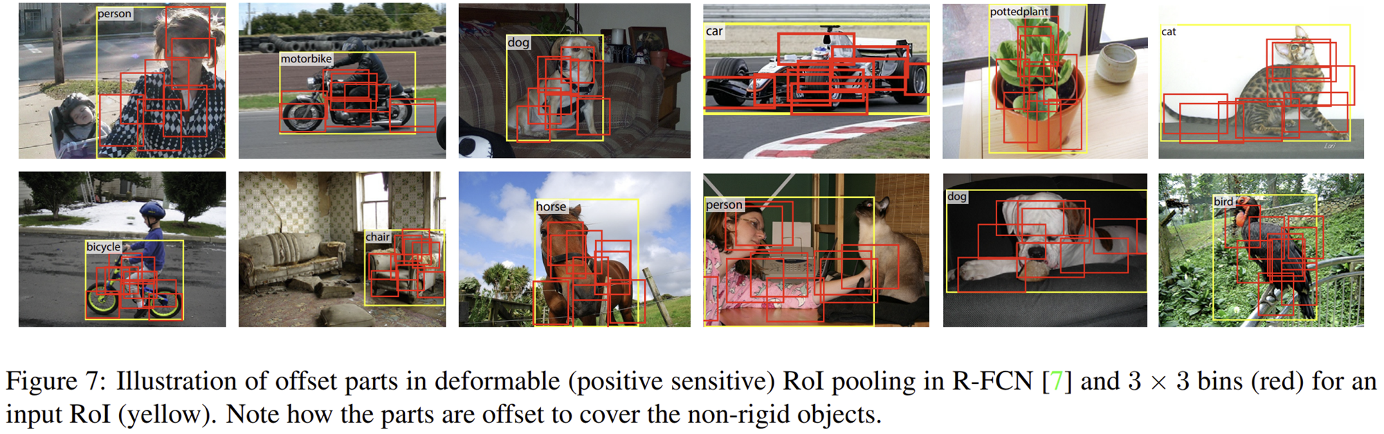 Deformable ConvNets는 객체의 다양한 형태와 자세에 따라 RoI(region-of-interest) 내부의 각 bin 위치를 능동적으로 조정하여, 보다 정확하게 객체를 탐지할 수 있습니다. 그림을 보면 각 객체(사람, 자전거, 자동차, 동물 등)의 RoI(노란색 박스) 내에서, bin(빨간색 박스)의 위치가 객체의 형태와 자세에 따라 다르게 조정되어 있음을 확인할 수 있습니다. 예를 들어 사람의 경우 얼굴이나 신체 부위, 자동차는 바퀴나 앞면, 동물은 머리나 몸통과 같이 중요한 부분에 bin이 밀집되어 있거나 위치가 조정됩니다. 이처럼 Deformable RoI Pooling은 고정된 RoI Pooling과 달리 비강체(non-rigid) 객체들의 형태에 유연하게 대응하여 객체 탐지의 정확성을 높입니다.