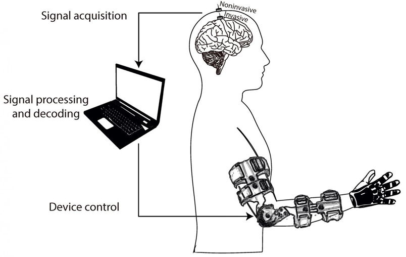 Brain-Computer Interface (BCI)는 위 그림과 같이 뇌와 외부 장비를 직접적으로 연결하여 인간과의 상호작용을 돕는 연구입니다. 위 그림과 같이 운동 재활 (Motor Reabiliation), 감정 인식 (Emotion Recognition), 그리고 인간-기계 상호작용 (Human-Machine Interaction; HMI)가 대표적으로 활용되는 분야입니다.