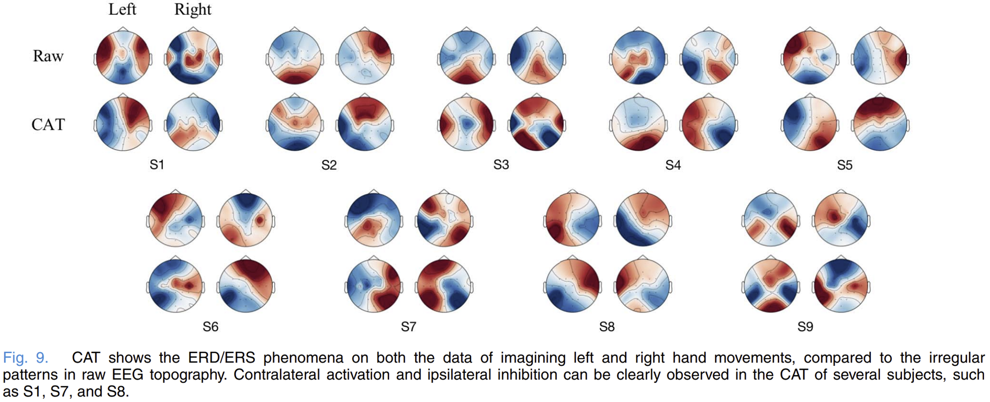 이러한 문제를 해결하기 위해 본 논문에서는 CNN과 Transformer의 self-attention을 결합한 EEG Conformer를 제안합니다. CNN을 통해 지역적인 디테일을 추출하고 self-attention을 통해 전역적인 문맥 정보를 추출하는 것이죠. 이때, CNN으로는 2D 합성곱이 아니라 2개의 1D 합성곱으로 설계하여 시간축과 공간축에 대해 각각 합성곱을 적용하여 특징을 추출합니다. 이렇게 얻은 특징을 self-attention에 입력하게 되고 이때 필요한 토큰은 이전 합성곱 모듈에서 얻는 시간축의 각 포인트로 정의합니다. 뿐만 아니라 본 논문에서는 컴퓨터 비전 분야의 대표적인 설명가능한 AI 중 하나인 CAM을 변형하여 EEG의 해석에 알맞는 CAT (Class Activation Topography)를 제안하였습니다.
