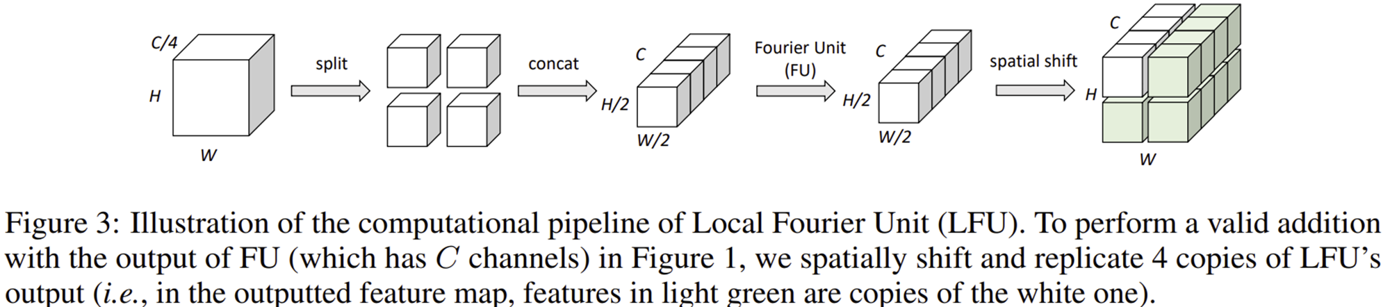 마지막 단계는 LFU입니다. 사실 이는 입력 특징 맵을 4개로 다시 분할하고 이를 채널 단위로 다시 합친뒤 FU를 거치는 것과 동일하기 때문에 더 자세한 설명은 하지 않아도 될 거 같습니다.