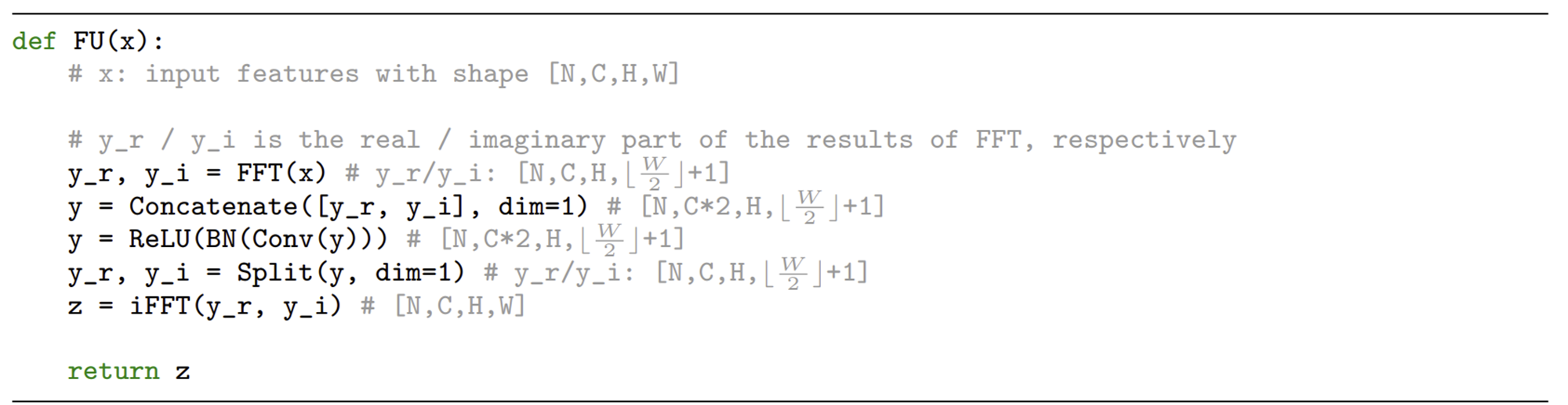 이를 위해 본 논문에서는 위의 의사코드와 같이 실수부와 허수부를 채널 레벨로 하나로 concat하고 일반적인 합성곱을 진행합니다. 그리고 두 개를 다시 분해한 뒤 inverse DFT를 적용하여 다시 spatial domain으로 되돌리죠. 여기서 이상한 점은 연산을 오직 $\lfloor \frac{W}{2} \rfloor$에서만 진행하는 것을 볼 수 있죠? 이는 DFT의 특성상 임의의 실수값을 가지는 신호에 DFT를 취하면 항상 Hermitian Matrix이 나오기 때문에 원점을 중심으로 대각선 방향은 대칭상태이기 때문입니다. 따라서 아래는 굳이 연산을 하지 않는 것을 볼 수 있죠. 또한, spectral domain에서의 값을 하나만 변경해도 그에 대응되는 spatial domain은 모든 영향을 받기 때문에 본 논문에서는 $1 \times 1$ 합성곱을 적용합니다. 그럼에도 불구하고 spatial domain에서는 전역적인 receptive field로 수행되는 것과 마찬가지인거죠.